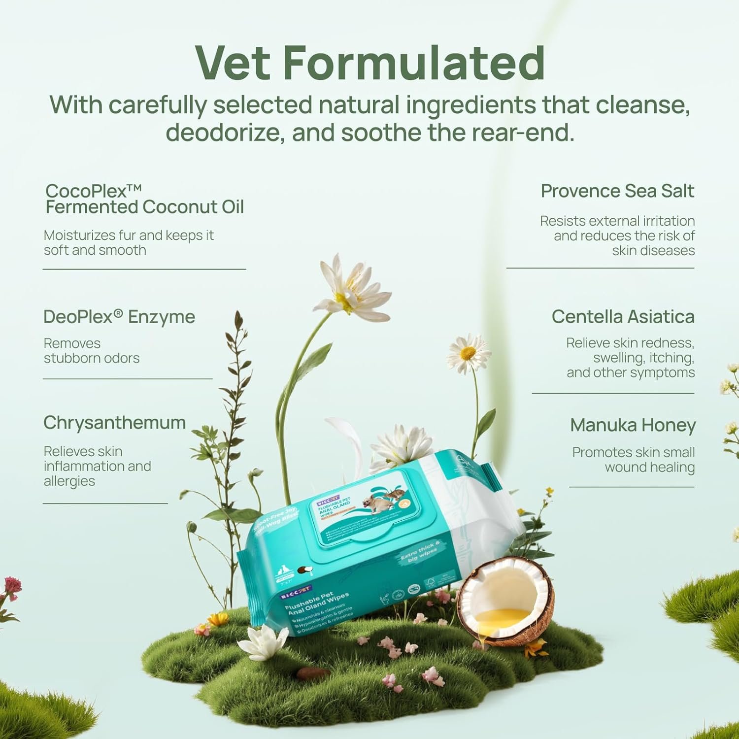 SUPPORT PAW & ANAL GLAND HEALTH: 6 natural plant extracts of DeoPlex Enzyme, Fermented Coconut Oil, Provence Sea Salt, Manuka Honey, Chamomile and Centella Asiatica. DeoPlex enzymes, a USDA NOP certified organic enzyme, quickly remove stubborn discharge and odor, while other extracts cleanse, soothe, moisturize, and support skin health.