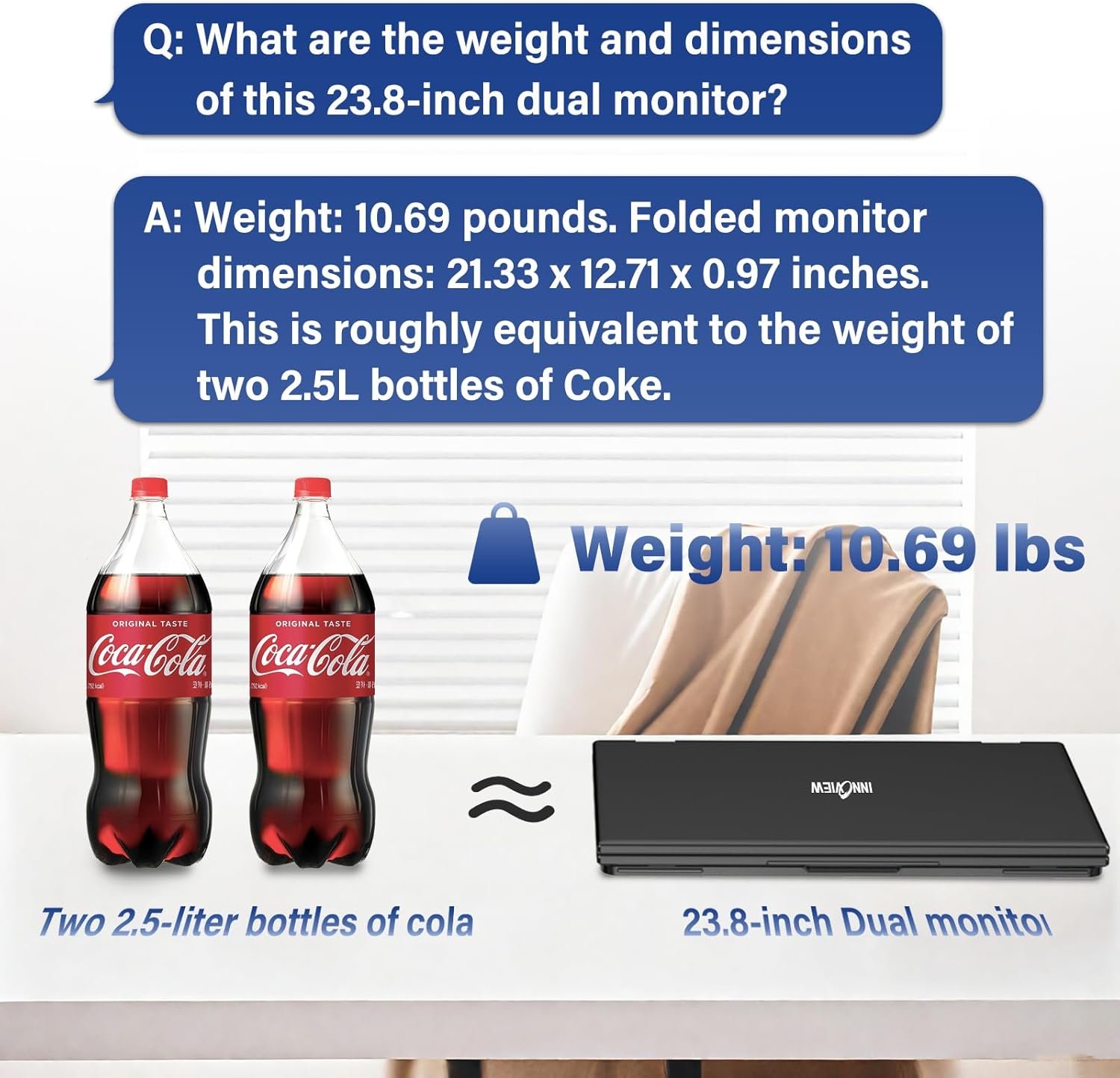 【Dual 23.8″ Folding Screen: Double Efficiency, Save Space】 Dual monitor 4K deliver doubled workspace instantly! Eliminate window switching – collaborate with documents, code, and previews side-by-side for soaring productivity. Fold to reclaim valuable desk space in seconds.Note: Due to its large size/weight, it is not recommended to carry it out for use.