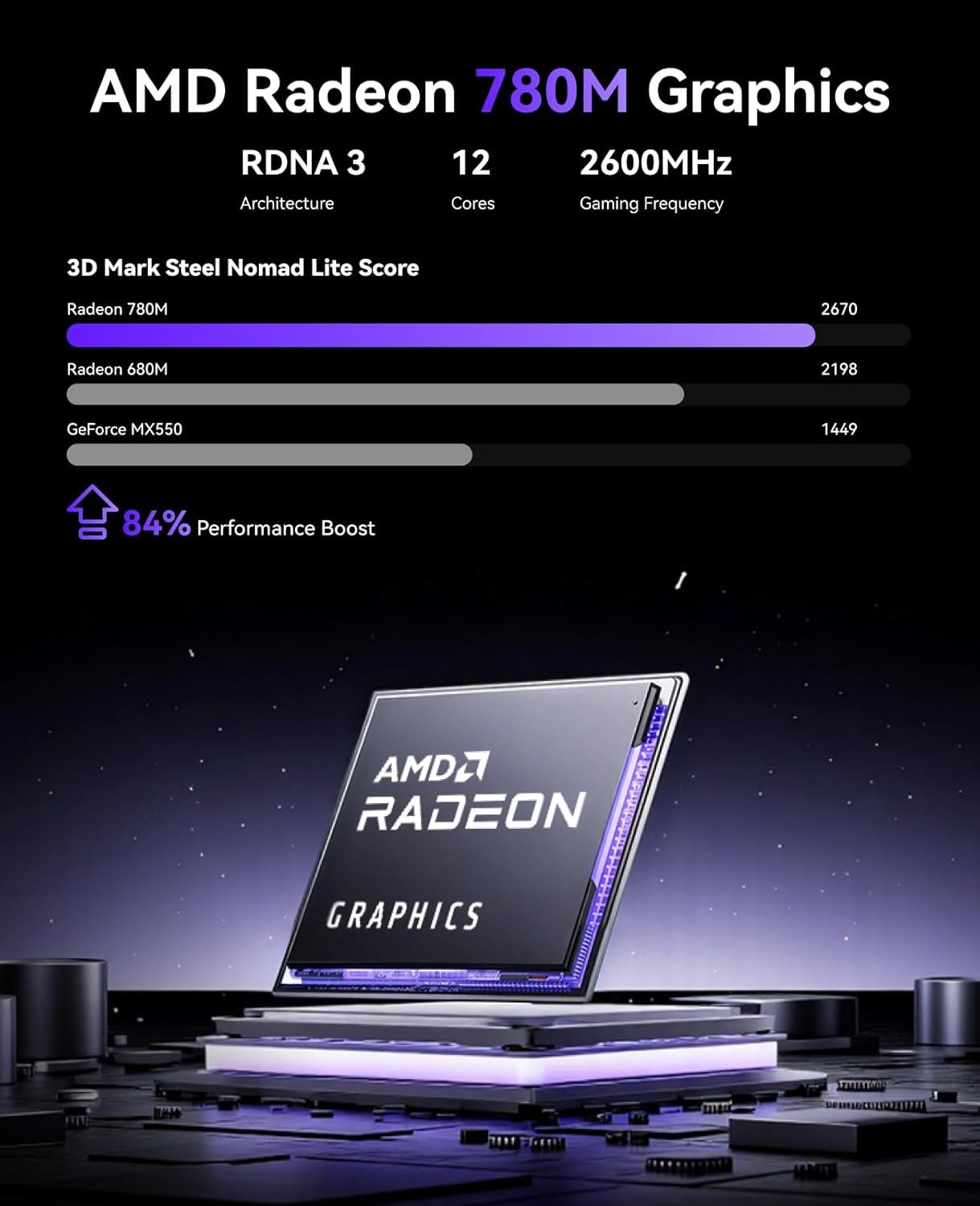 FOUR-SCREEN 4K DISPLAY: KAMRUI AM21 Mini Gaming PC is equipped with an integrated Radeon 780M GPU (2600MHz, 12 units) based on the RDNA3 architecture, which significantly boosts graphics performance. With USB 4, USB 3.2 Type-C full functionality, 2 HDMI 2.1 enables four-screen display, allowing you to expand your workspace up to 4 monitors, ideal for multitasking