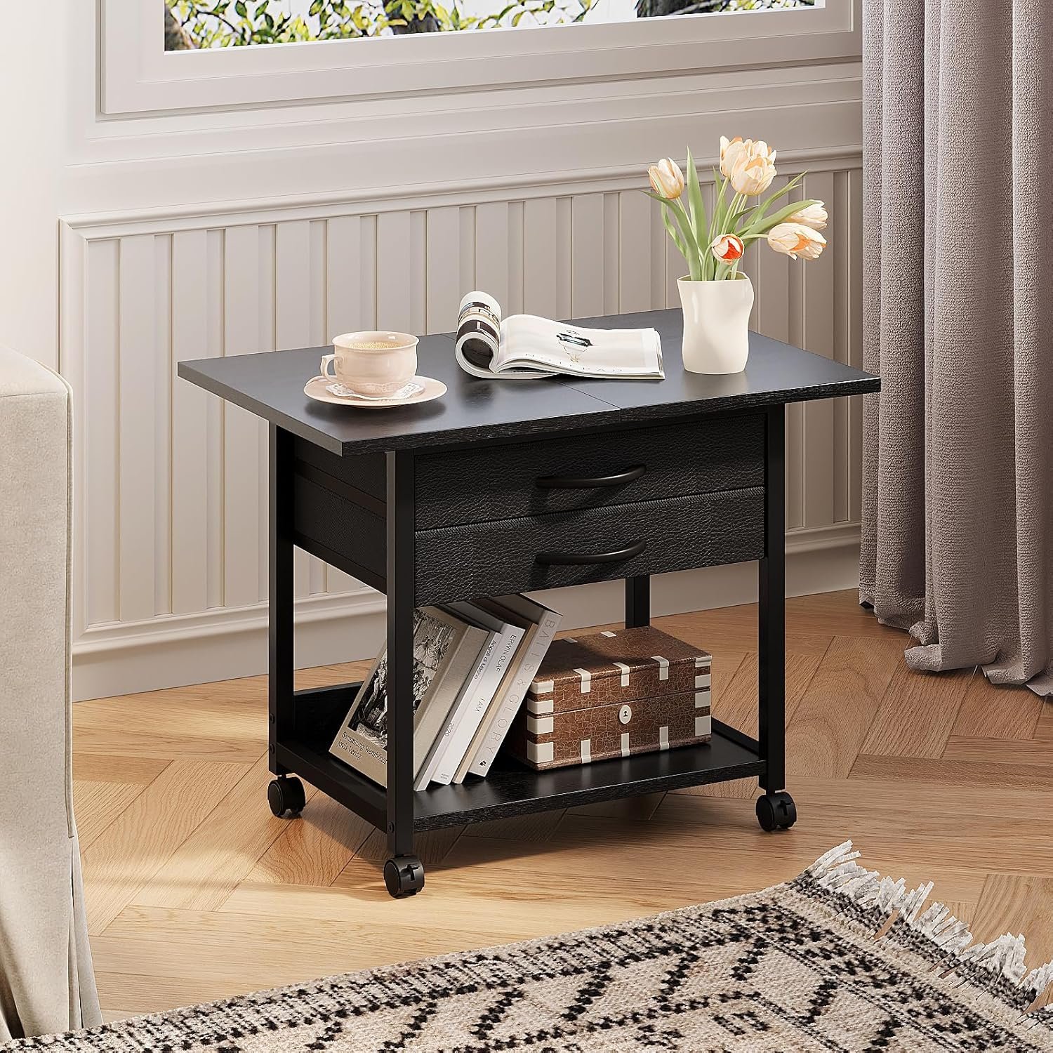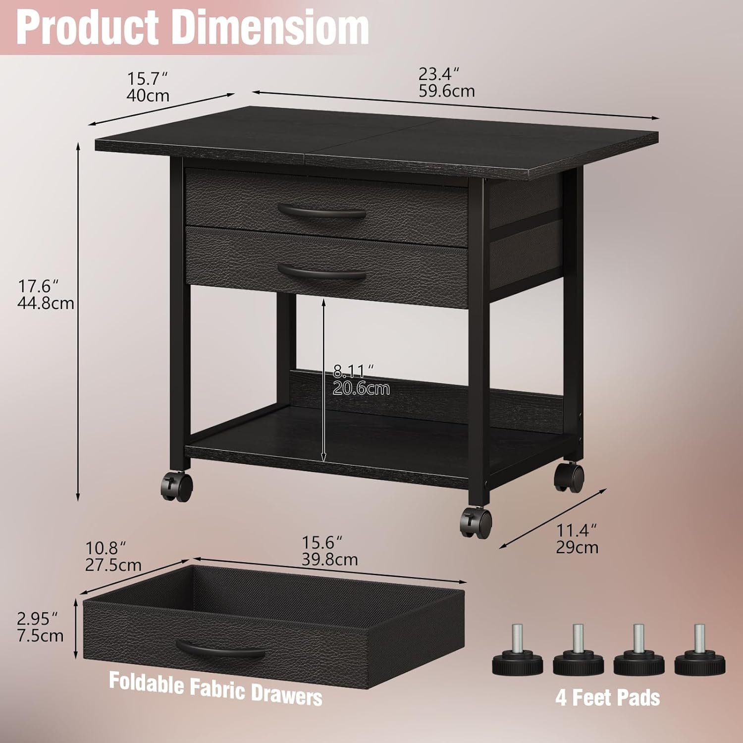【Smart 2-Tier Storage Design】Features 2 pull-out fabric drawers for private item storage and two open shelves to organize paper, ink cartridges, folders, or stationery. Keeps your workspace tidy and maximizes vertical space efficiency.