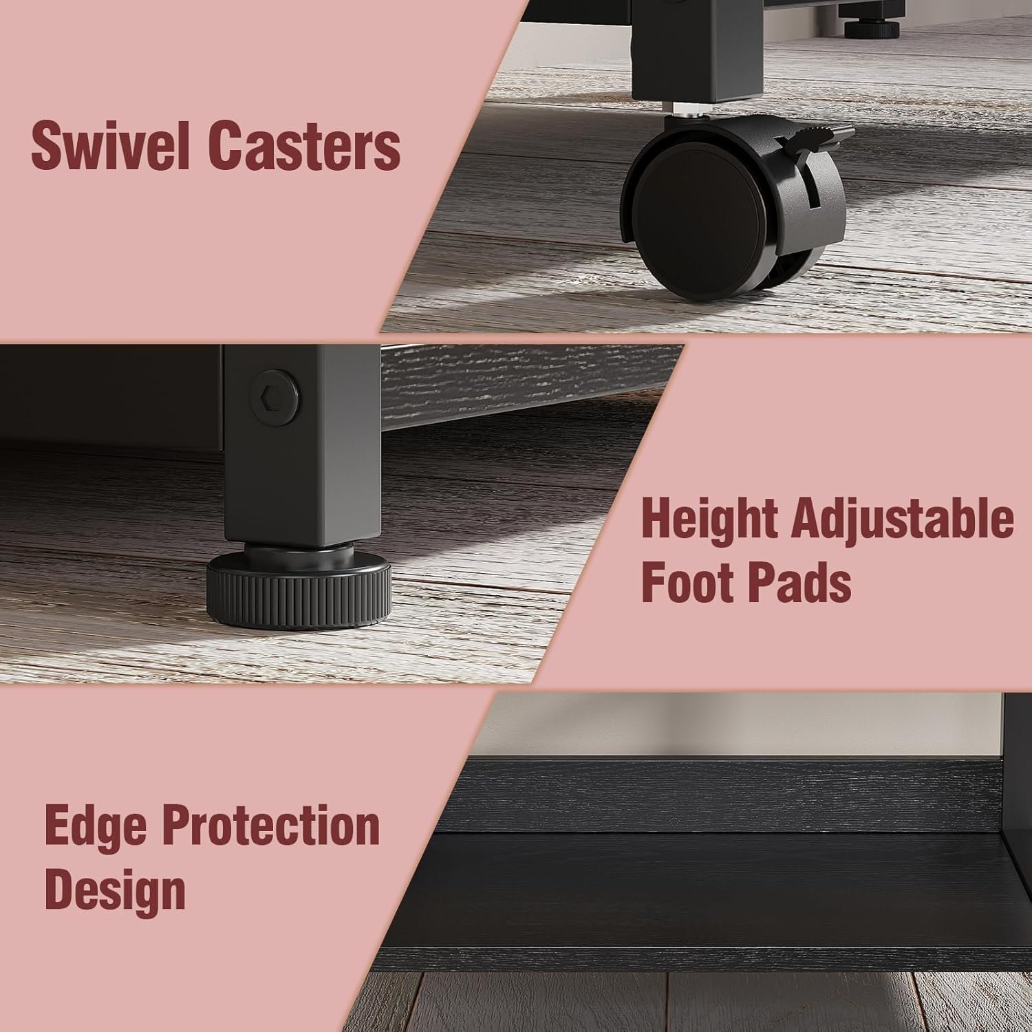 【Heavy-Duty & Stable Build】Robust iron frame and high-quality engineered wood shelves support up to 70 lbs per tier. Water-resistant surfaces are easy to wipe clean, ensuring long-lasting use.Adjustable feet pads and casters are both included.4 casters with 360° rotation,2 lockable wheels allow a stable stop,so you can roll it around within the workspace for use or secure it in place wherever you want