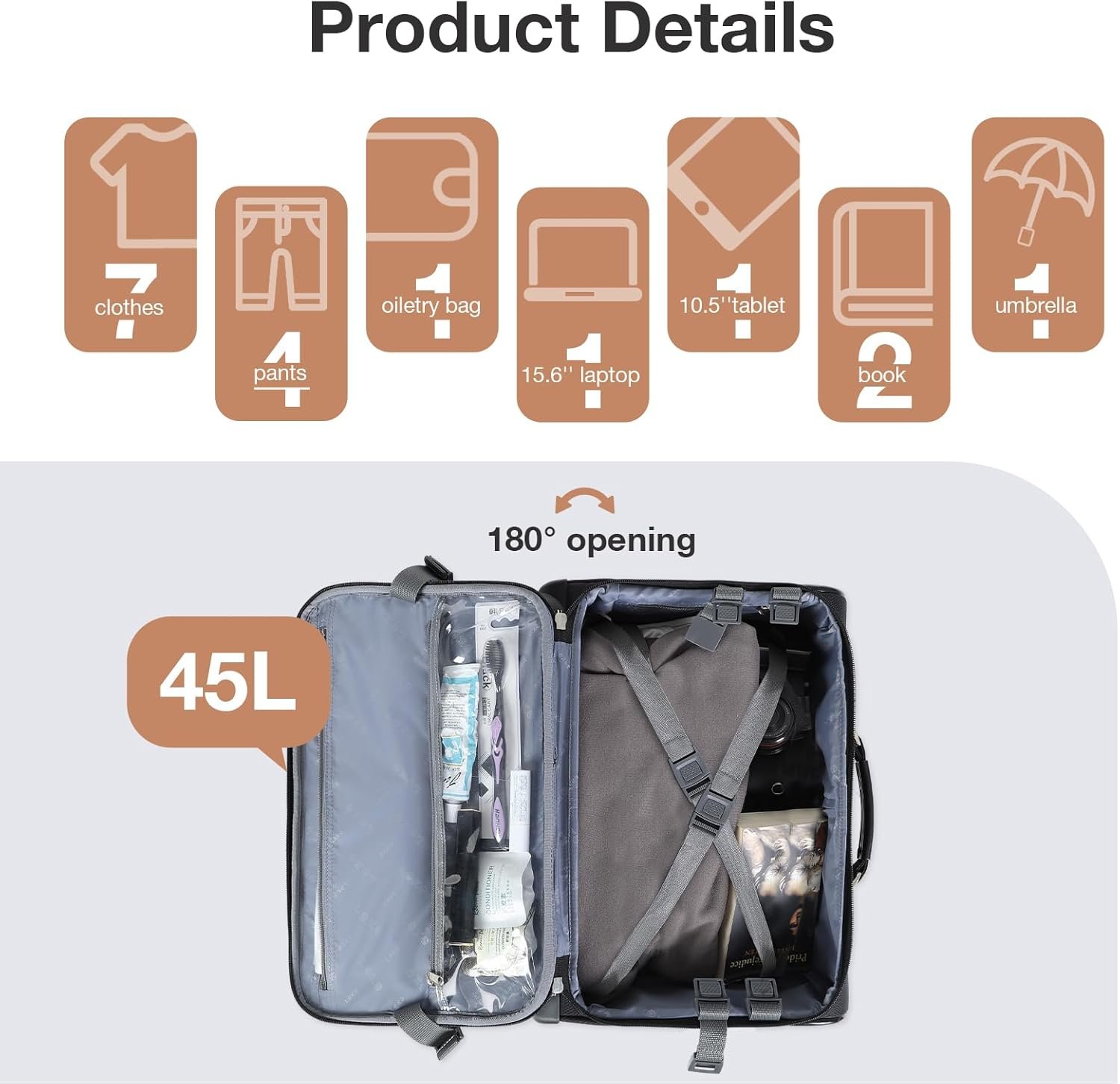Removable laptop Sleeve: The spacious main compartment can accommodate overnight clothes, documents, and other daily essentials, and comes with a removable 16.5-inch padded laptop sleeve for convenience during airport security checks. Additionally, it features a waterproof pocket, a storage pocket, a side water bottle pocket, and a front compartment for items such as pens, business cards, and mobile phones