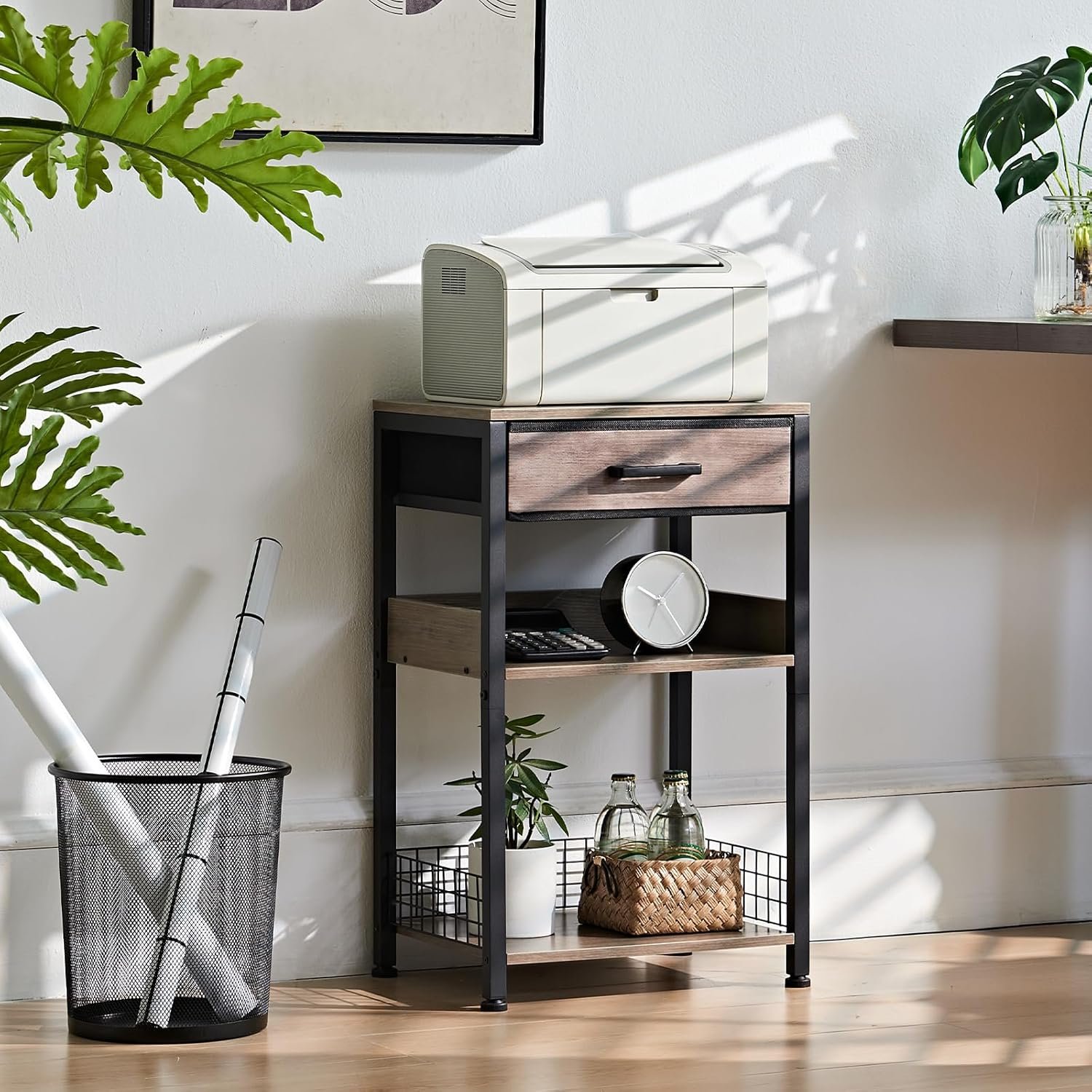 [3 Tier Printer Stand] The modern side table spacious tabletop can hold multiple sizes of printers, providing more storage space in your study and office!You can keep books, folders, printing papers, etc. on the open storage shelves. And the drawer store staplers, pens and other small office supplies.This desk side printer table with storage function makes your office supplies neat and within reach,improving work efficiency!