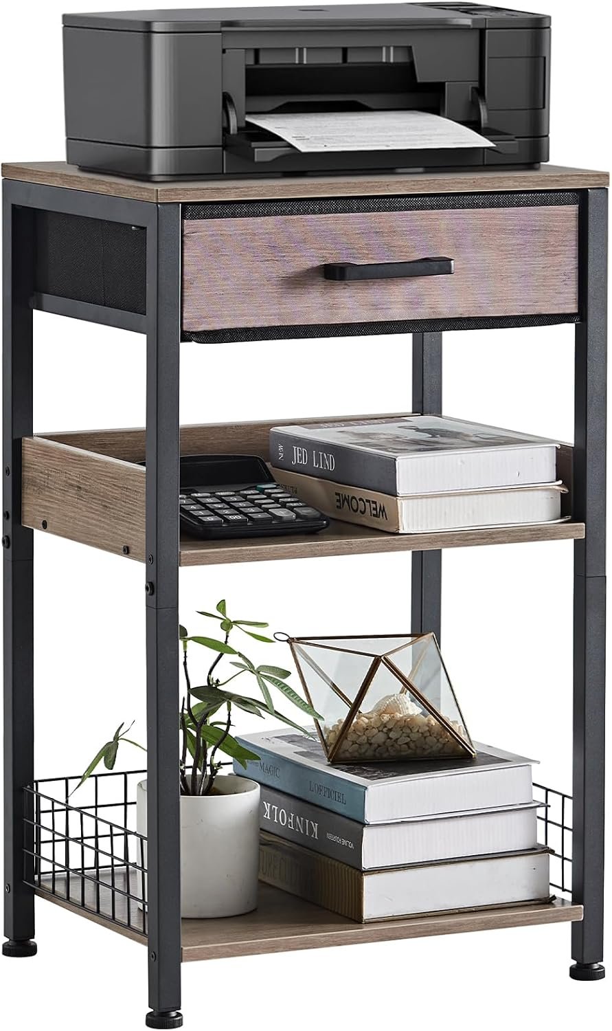 Lerliuo Grey Printer Stand with Fabric Drawer, 3 Tier Industrial Side …