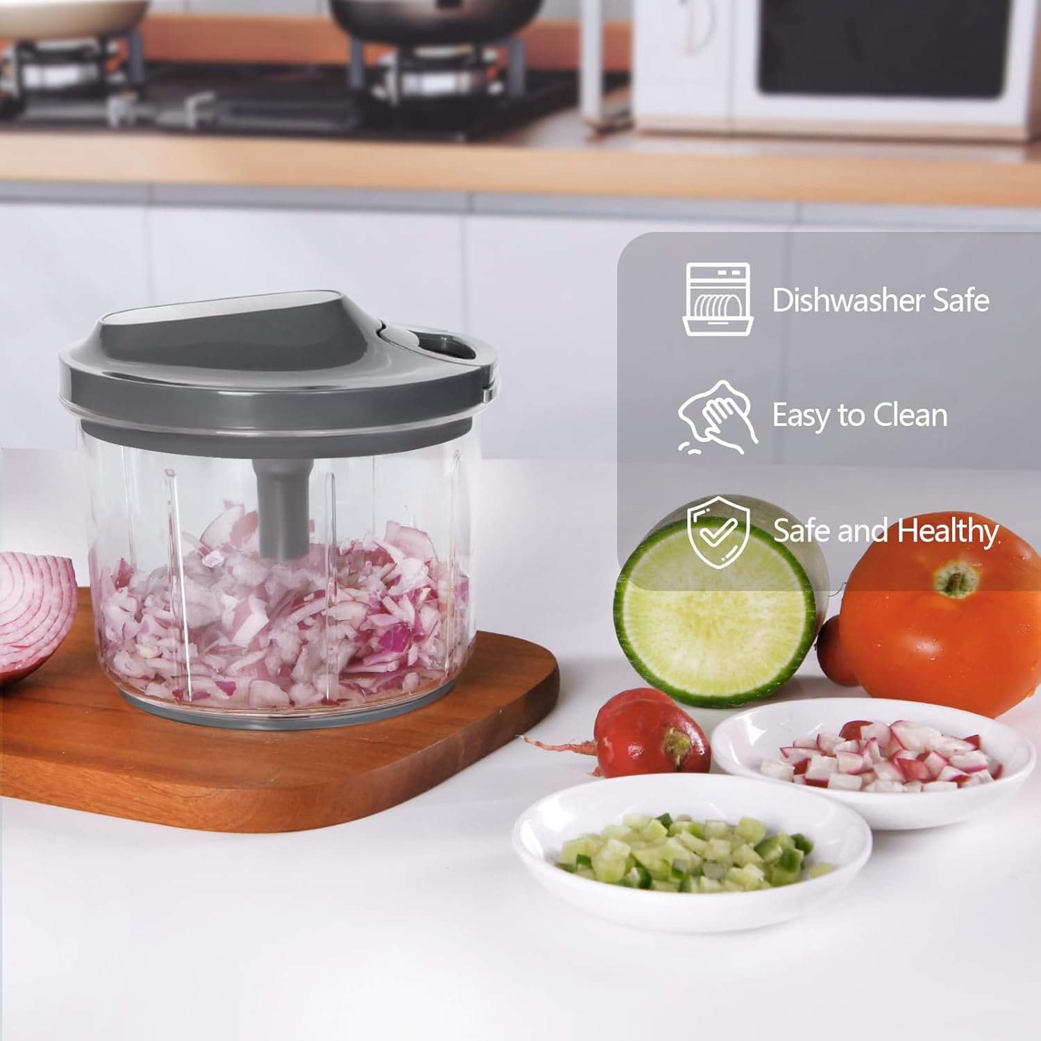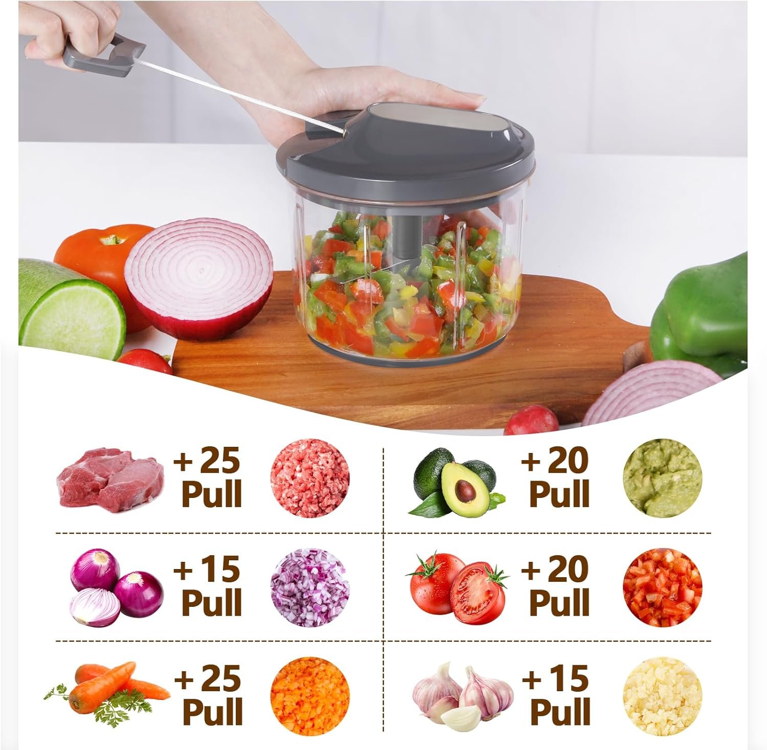 Efficient Design of Three Blades:The three blades of the pull string chopper are distributed at different heights and directions for more efficient and even cutting, chopping in seconds. With just a few simple steps, you can easily cut vegetables. BPA Free