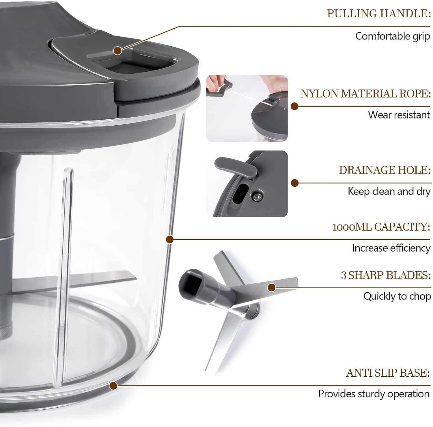 LHS Manual Food Processor Large Vegetable Chopper, 1000ML Pull String Chopper Garlic Mincer Onion Cutter for Veggies,Salad,Fruits, Nuts, BPA Free, GREY