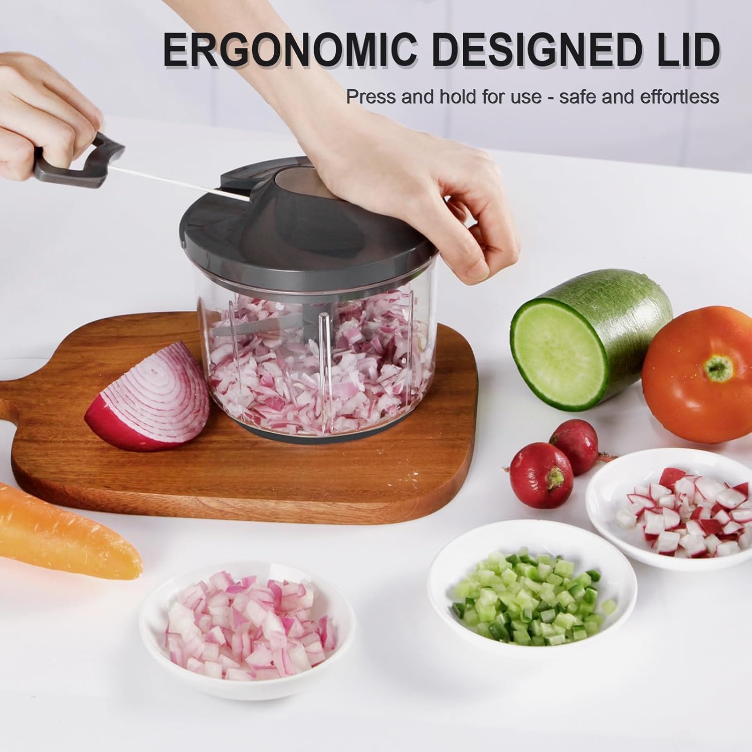 1000ML Large Capacity vegetable chopper Container: The oversized transparent container improves the efficiency of kitchen preparation. It can hold whole onions cut into 4 pieces, as well as large pieces of vegetables and fruits. Highly transparent container can directly show the condition of vegetables.