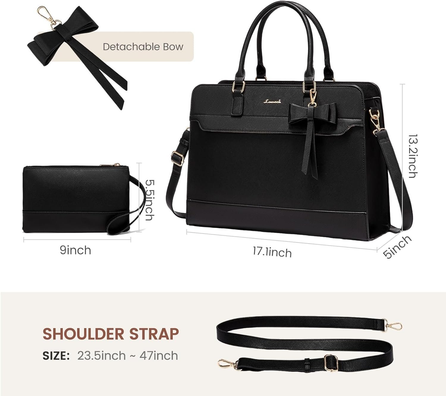【Perfect Size Womens Briefcase】: Size of the laptop bag is 17.1″Lx5″Wx13.2″H, finished with a secure zip-top closure. With a removable shoulder strap varied from 28.3 inches to maximum 49 inches and adjustable handles, You be carried in several ways as a ladies briefcase,teacher tote bag, computer bag for women or messenger bag,work bag as well, convenient and comfortable.
