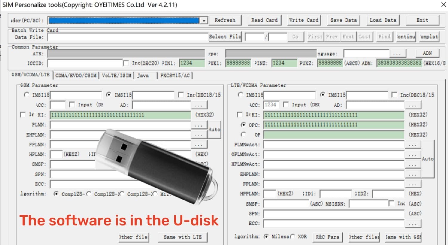 Can be written ICCID, IMSI,PIN,PUK,ADM, KI, OP/OPC SMSC technologial information into card