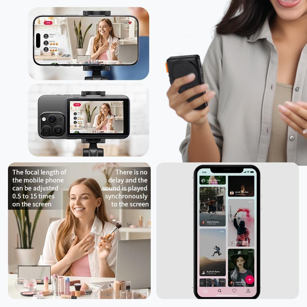 Real-Time Screen Sharing for Perfect Selfies and Vlogs:Experience flawless self-portraits and professional-grade vlogs with our real-time screen sharing phone vlog selfie monitor screen. This innovative tool lets you view your phone’s screen in real-time, ensuring perfect framing and clarity for every shot. Say goodbye to awkward angles and blurry images!