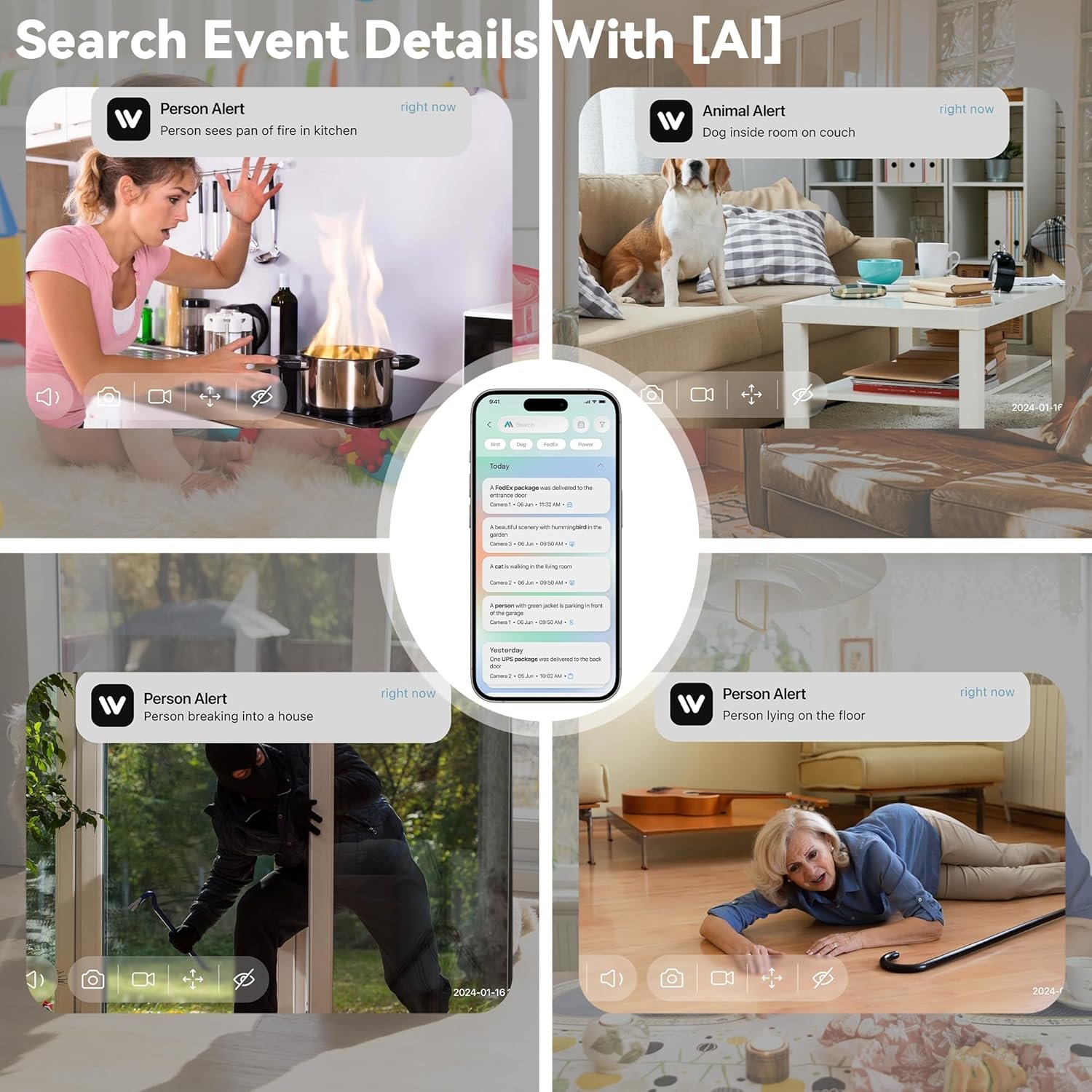 Contextual AI Notification & Smart Search History : The home security camera indoor adopts Smart Perceive Technology to detect movements. The contextual AI sends customized notifications about activities like people, vehicles, or animals, reducing false alarms and enhancing security. With Smart Search History, you can quickly locate video clips using keywords or descriptions,improving monitoring efficiency