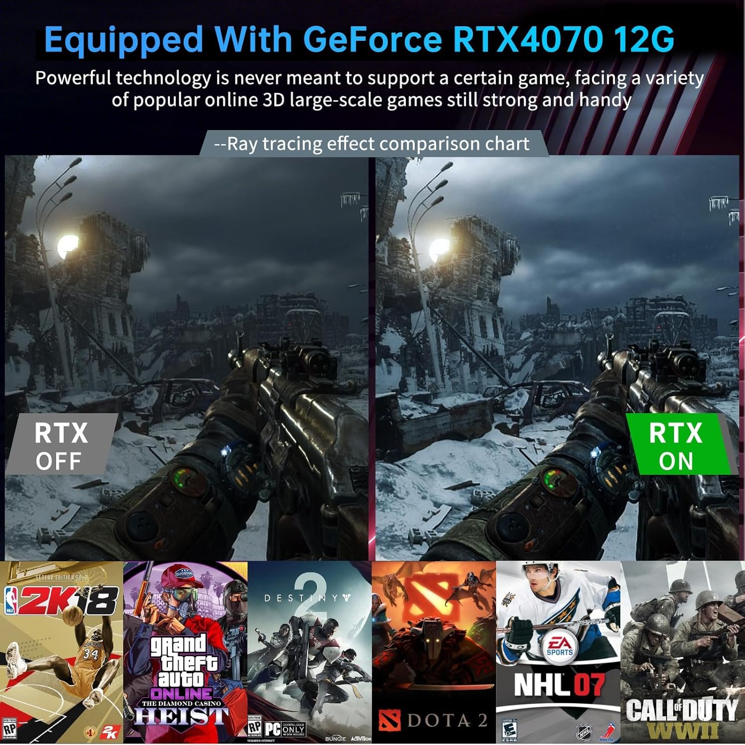 [8K@60Hz Four-Display] Mini PC equipped with GeForce RTX4070 12G GDDR6X discrete graphics card, supporting ray tracing and AI cores. easy connect 4 monitors, 1 x HDMI and 3 x DP1.4 ports(All Support 8K@60Hz display), It can provide you with a first-class TV experience and realistic picture quality, for your visual home entertainment, streaming video, web browsing, work design and 3D games create a very smooth experience.
