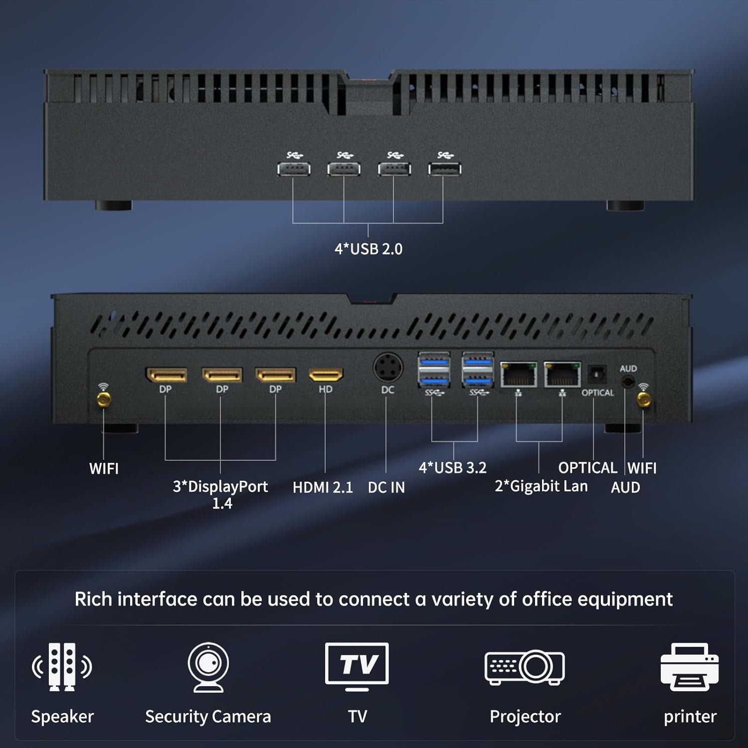 [Functional Interfaces] Mini computer is equipped with 4 x USB3.2, 4 x USB2.0, 1 x HDMI port, 3 x DP ports, 2xRJ-45 Gigabit Network Ethernet, 1 x Fiber Optic PORT, 1 x Audio in/out. Built-in Bluetooth 5.3 and 802.11AX wifi 6E, Increase transmission distance and signal stability. Mini PC supports multiple device connection and can be used with servers, monitoring equipment, office equipment, projectors, televisions, etc, Mini desktop computer support automatic power on and Wake On Lan.