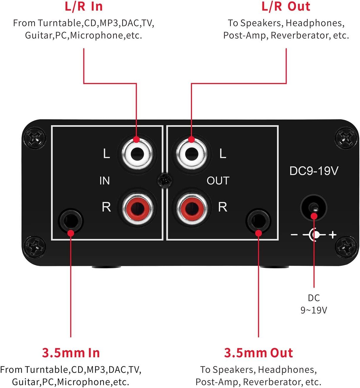 Input: RCA (L / R) + 3.5mm, Output: RCA (L / R) + 3.5mm + headphones, Poowered by DC 9-19v, static current about 8Ma. With volume adjustment knob, the volume can be adjusted freely.