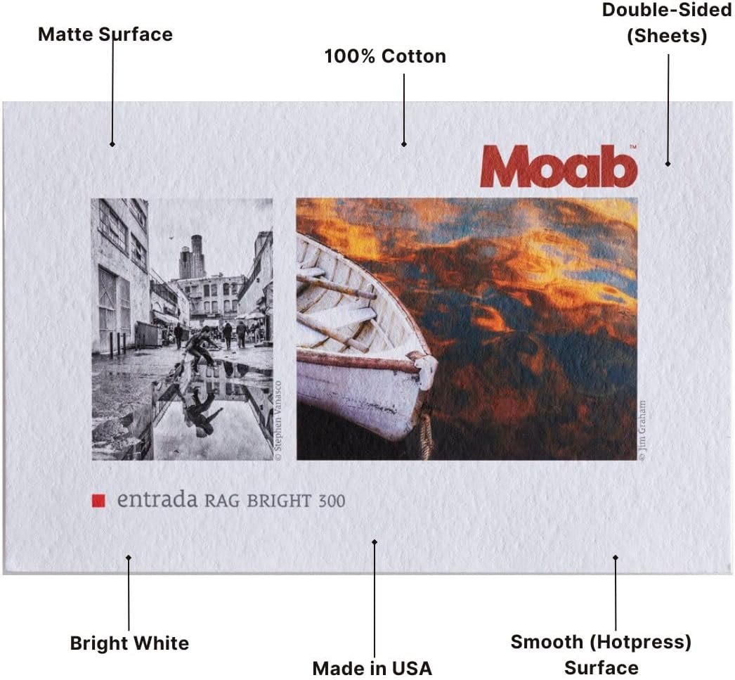 Award winning Entrada Fine Art is what makes Moab Paper Company stand above thecompetition. Entrada Fine Art Bright White is a dual sided 100% cotton rag paper. It utilizes multiple receiving layers which equate to a superior ink load capacity allowing for features unique to Entrada, including water resistance, instant drying and prints with incredible detail and excellent tonality. Entrada also features a maximum color gamut and exceptionally deep blacks. This paper is compatible with both dye and pigment inks and works remarkably well with the latest Epson Ultrachrome inks. Entrada is available in 190gsm and 300gsm.