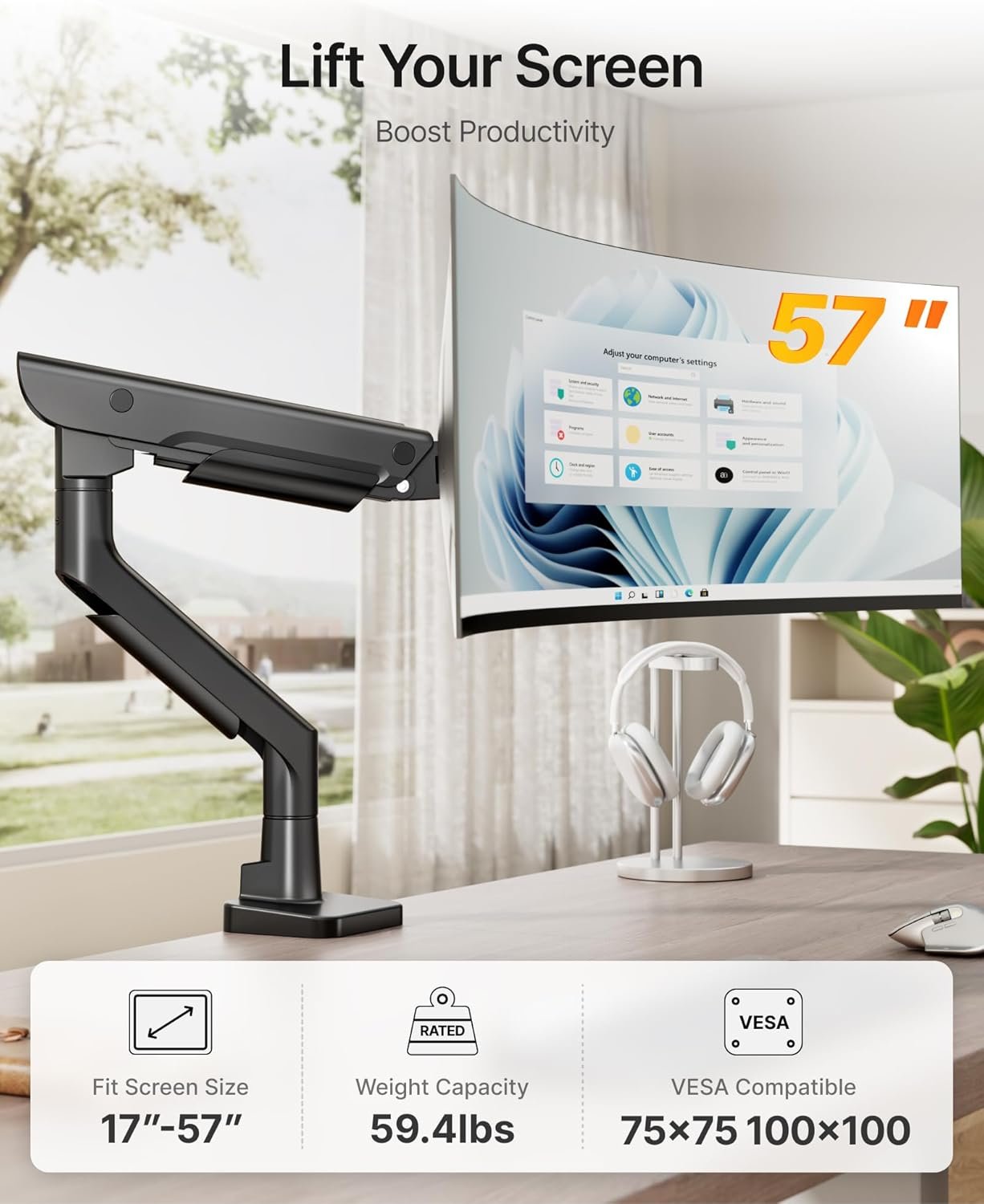 【Ultra-Stable Support up to 59.4 lbs & 57” Displays】Supports monitors from 17″ to 57″ and up to 59.4 lbs, including ultrawide and curved displays. Compatible with both 75x75mm and 100x100mm VESA mounting patterns, this arm ensures a rock-solid hold and flexible adjustment for even the largest screens in your setup.