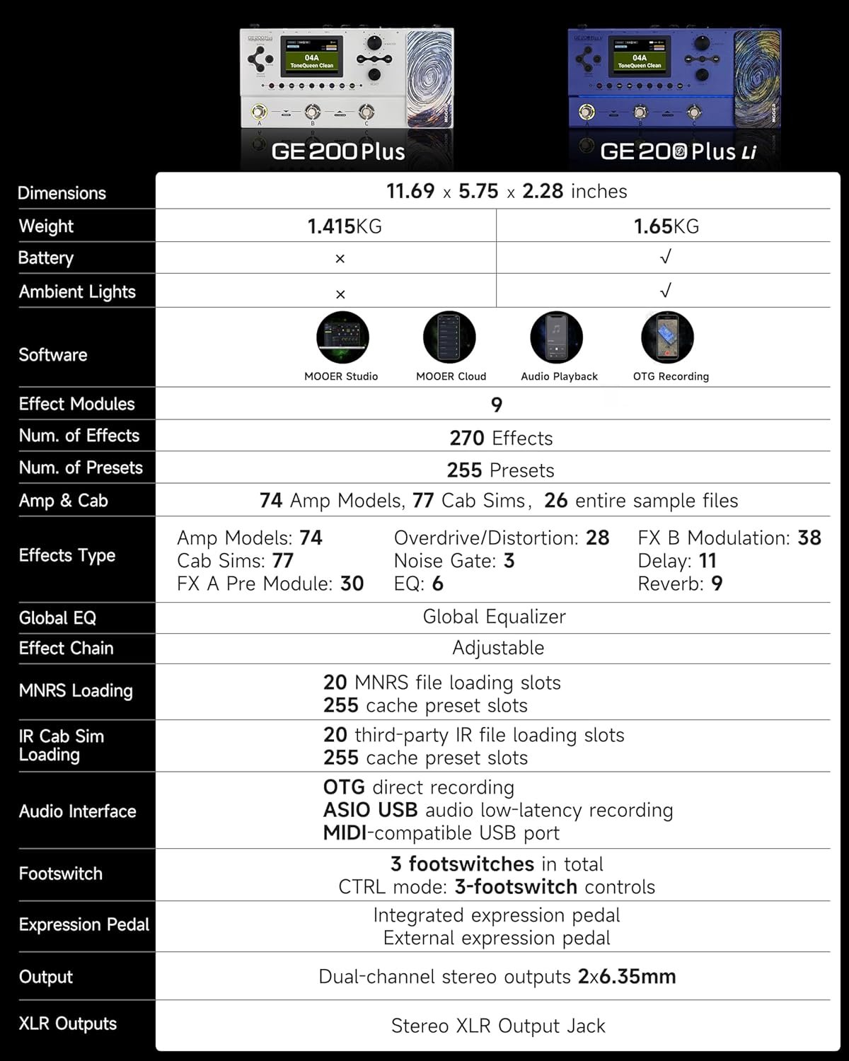 GE200 Plus Series, Powered by the brand-new GE series design language and user interface and retains the iconic GE series quick-access effect module buttons with 7 additional buttons for simple function access. Dedicated PC preset editing software and It is compatible with the MOOER Cloud for uploading and downloading presets and sample files