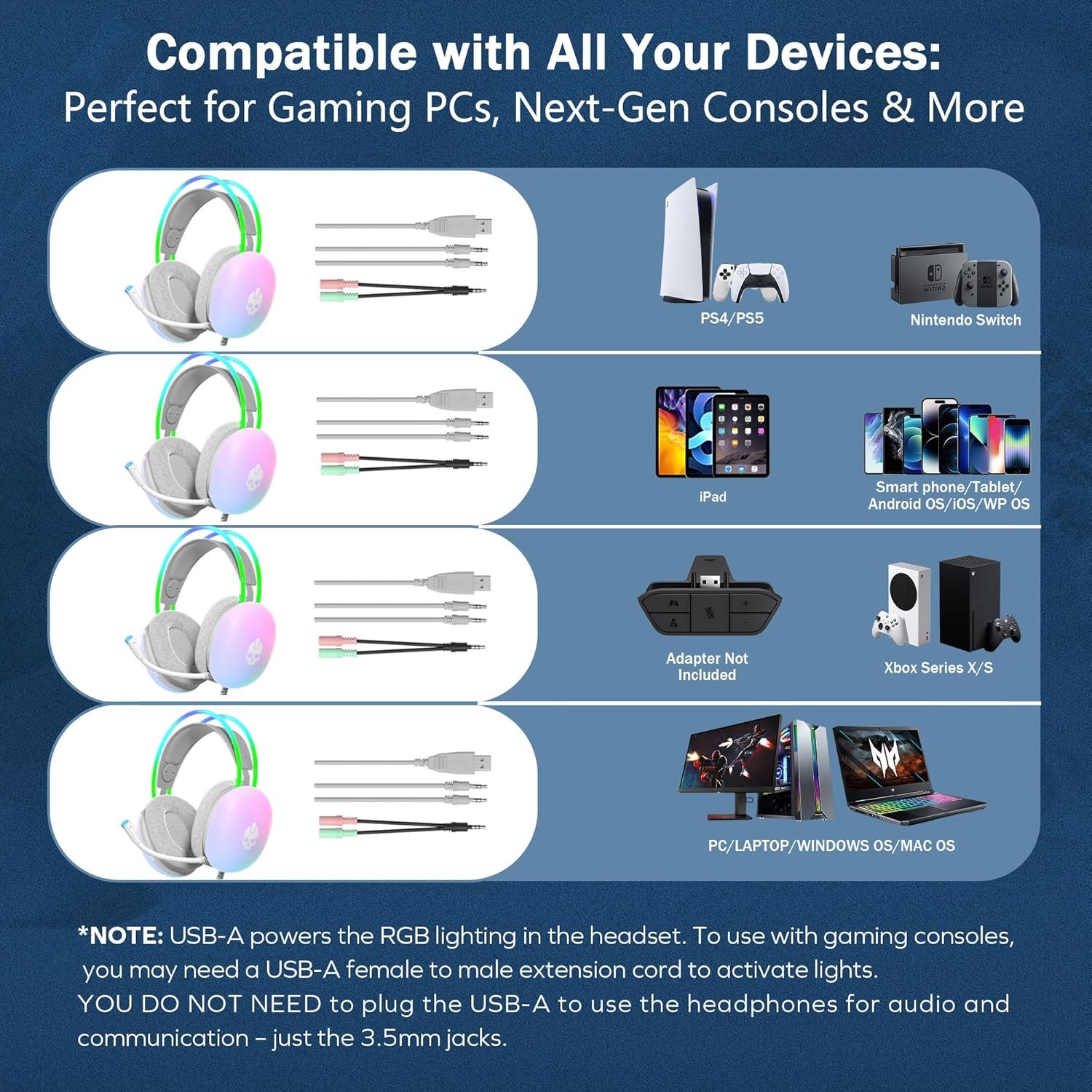 EASY CONNECTION OPTIONS: Simply plug the 3.5-millimeter jack into the appropriate port to use these wired headphones for gaming. The gold-plated plug improves sound quality and durability. To power the rainbow lights, plug in the USB-A cable, though you may need a USB-A female-to-male adapter to connect to certain consoles.