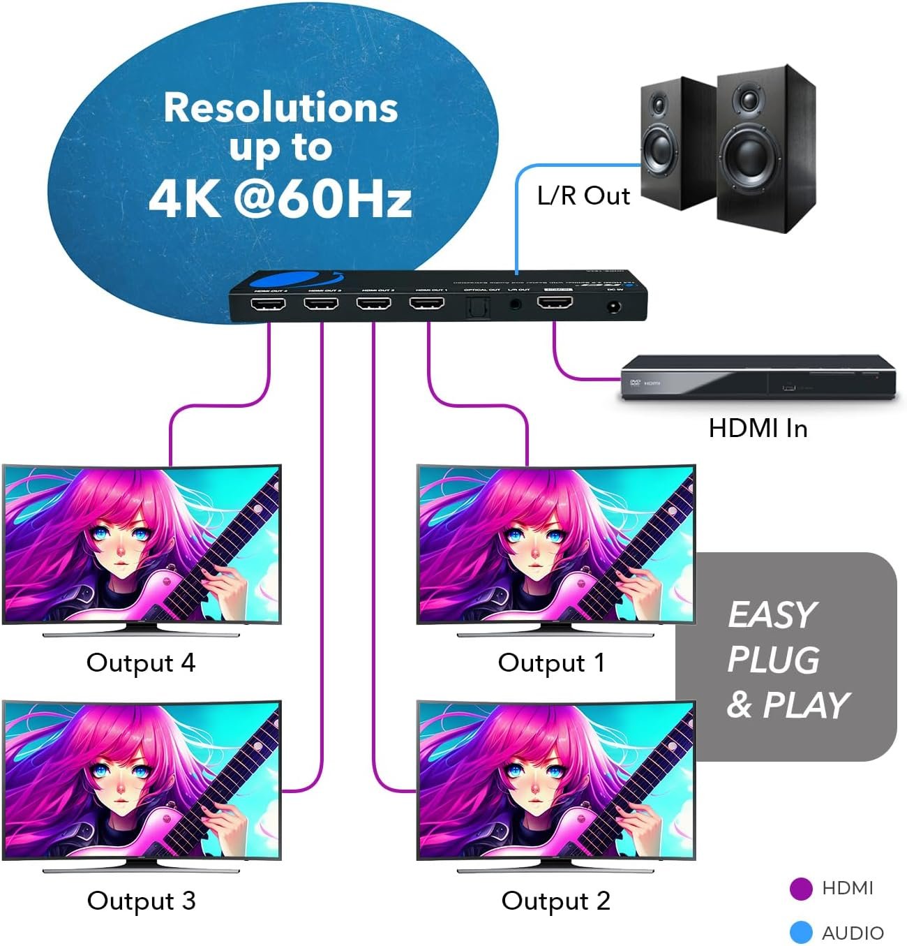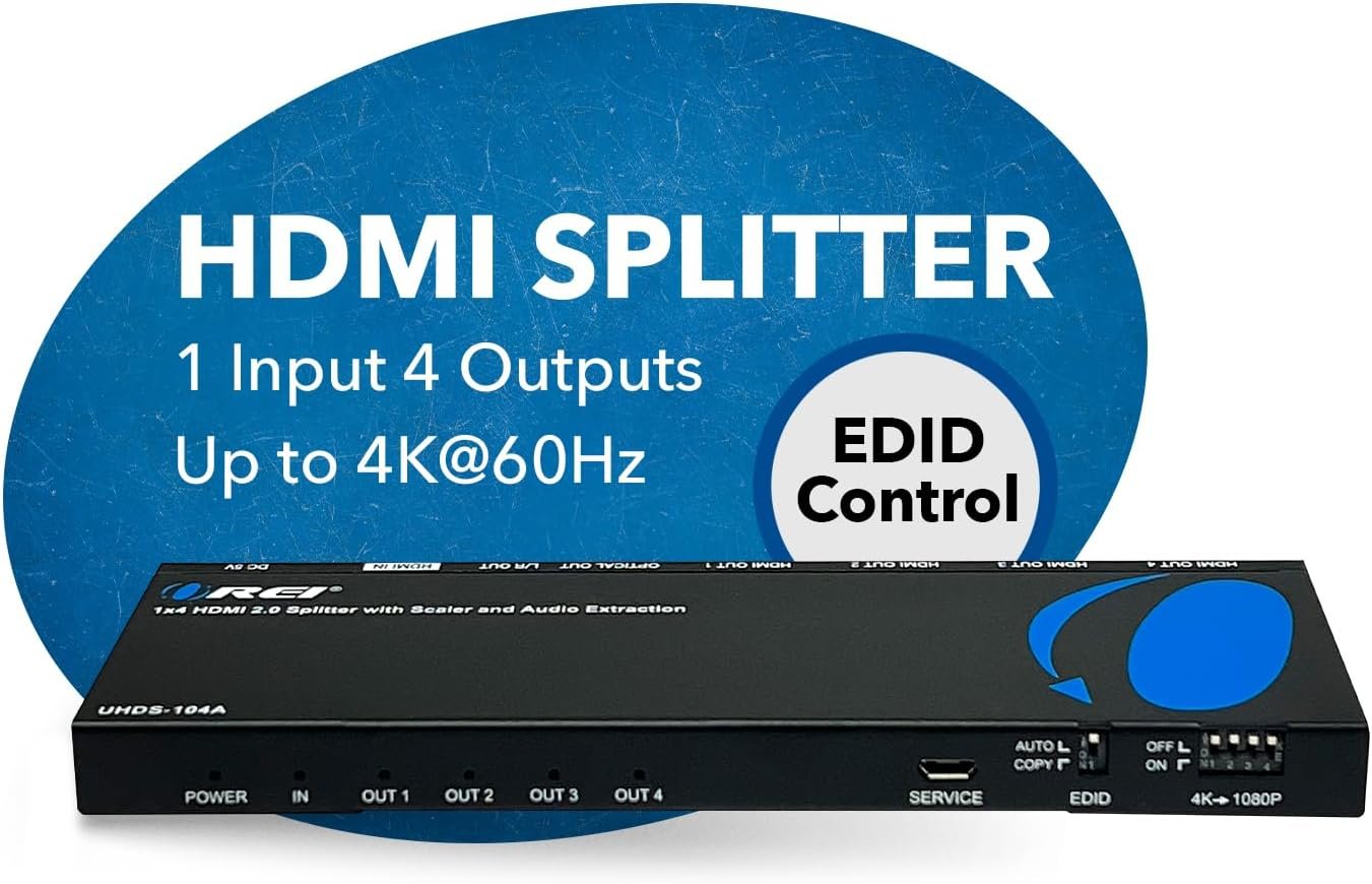1 input (1 Source) to 4 Output (4 Display) Supports HDMI 2.0 with EDID1 HD Source in to 4 HD Display – Supports Version 2.0 – Splitting one HDMI input signal into two HDMI output signals identical to the input signal.