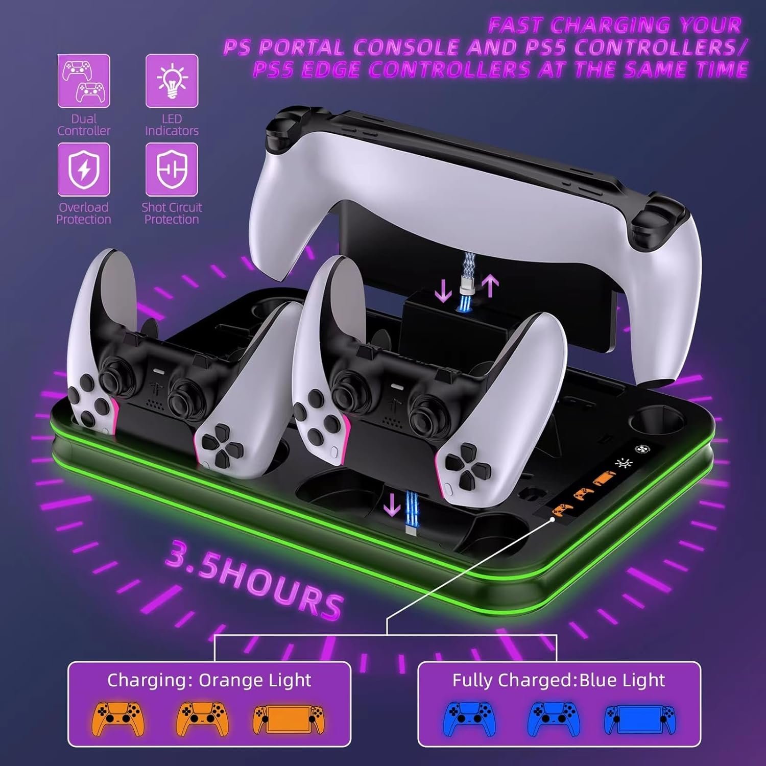 PS PORTAL MAGNETIC CHARGING AND DUAL FAST WIRELESS CHARGING STATION – There are two ps5 charger station for PS5 controllers charging at the same time,and a magnetic charging station designed specifically for the ps portal handheld. Charging is very easy and it only takes 3 hours to fully charge all devices. There are also charging indicators, with an orange light indicating that it’s charging and a blue light indicating that it’s full.