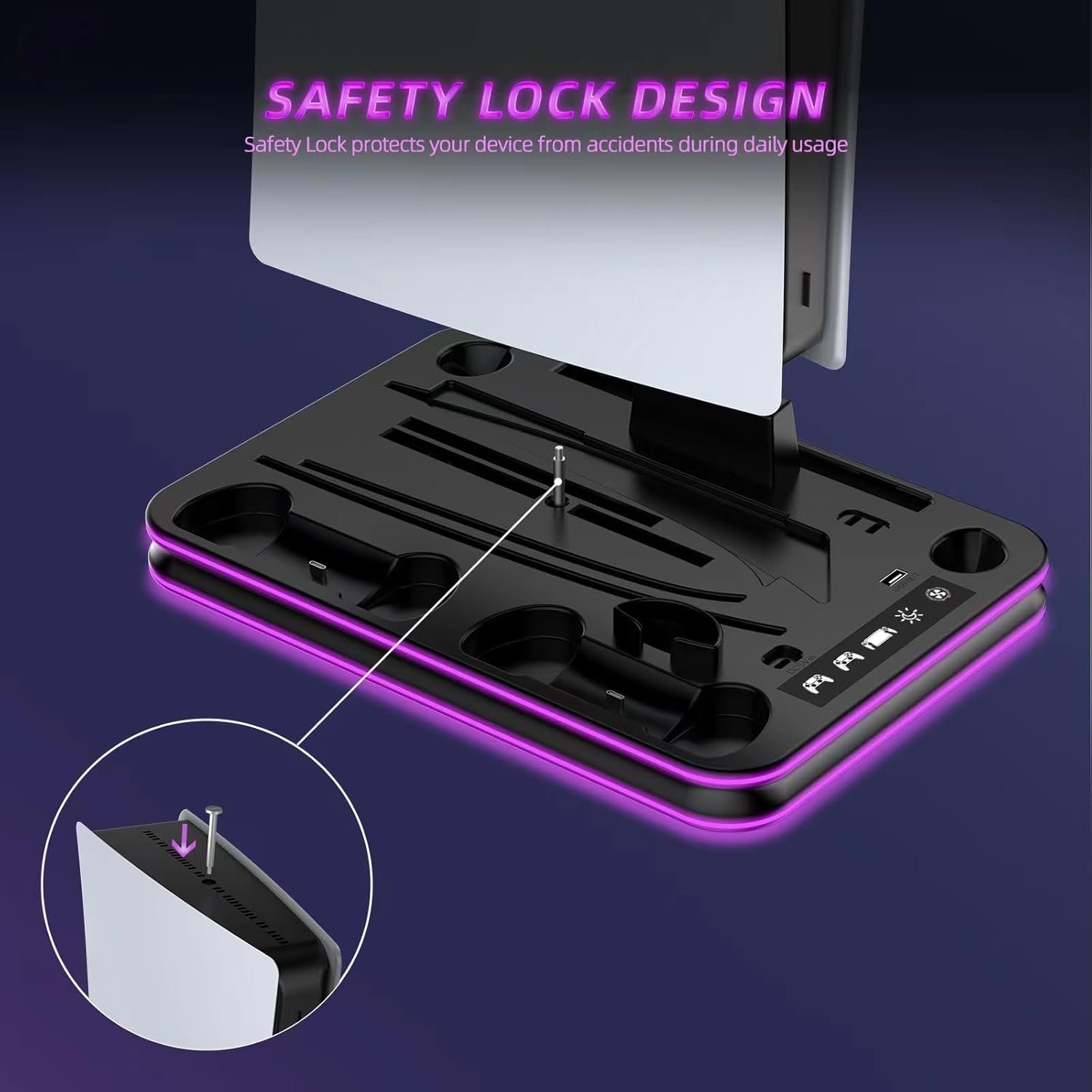 3 LEVEL PS5 COOLING FAN AND COOL RGB LIGHTING – The PS5 cooler stand vertical is equipped with a touch switch and 3 Level Cooling Fan, that suck hot air from the bottom of the console and effectively dissipate heat in all directions. The PS5 Multi-functional base with 5 vibrant RGB color options match your gaming ambiance and personal style. Long press the button for 2 seconds to turn on or off, short press for one second to switch the color.