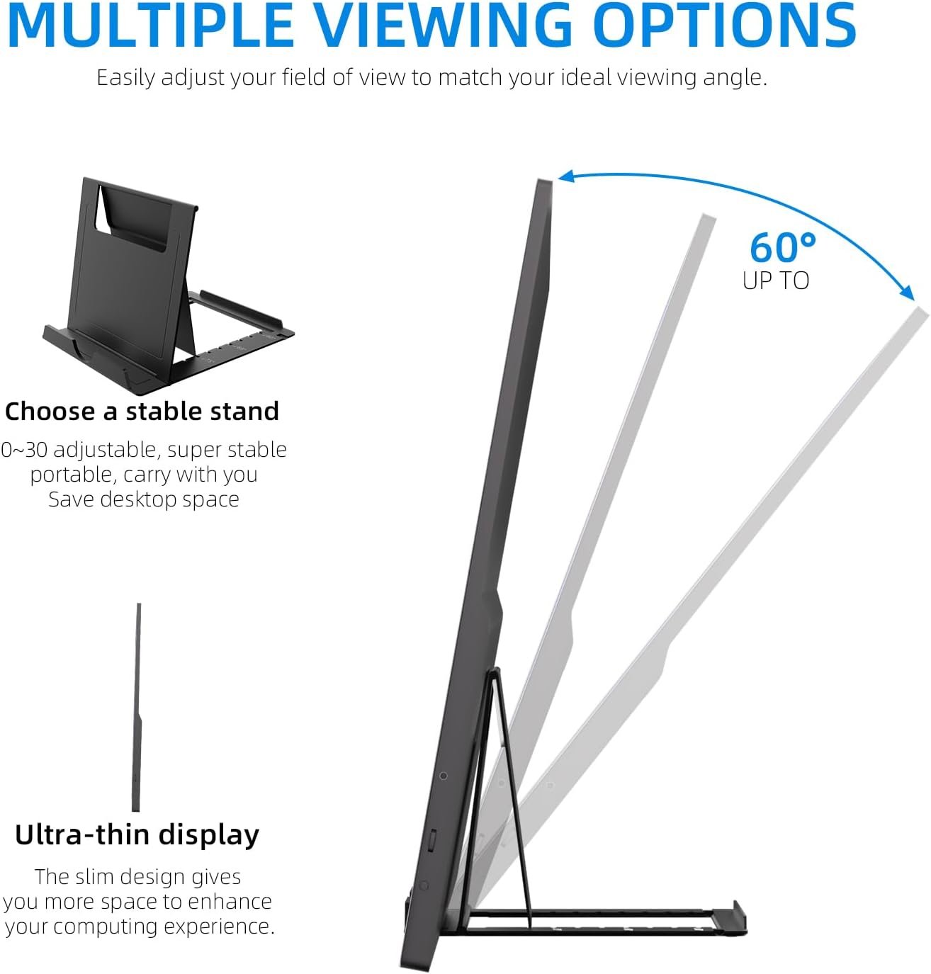 Full HD 1080P IPS Display: FMC15.6-inch portable display adopts an advanced IPS screen with a resolution of 1920 x 1080 and supports 178° all-round viewing angle, 60HZ refresh rate, FreeSync features. It can not only perfectly present accurate and bright colors, and display stunning details, but also reduce blue light radiation and protect eyes from visual fatigue, making it the best choice for home and travel monitors.