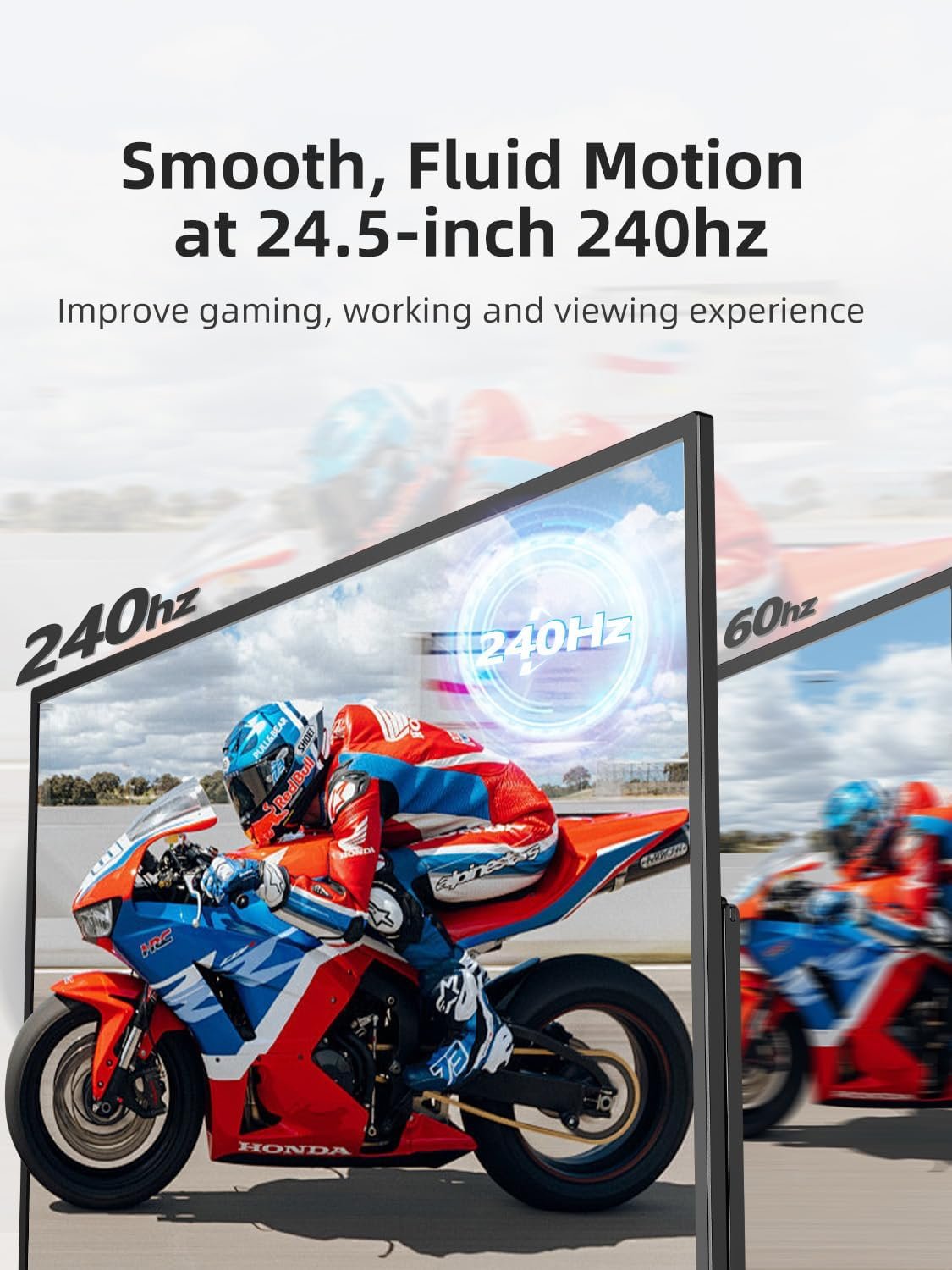 Ultra-Lightweight, Slim and Portable: No matter you go on a short journey or long distance traveling, it can be your ideal travel partner; Take EPORMOT 24.5” 240 Hz monitor with you can boost your prodcutivity, improve your watching and gaming experiences wherever you go