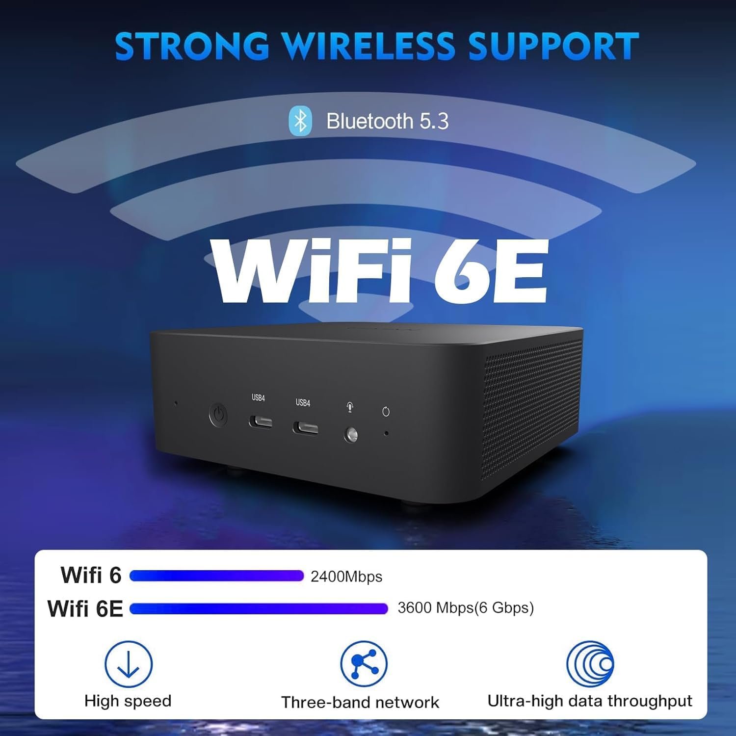 【Intel Wireless Technology】Mini gaming pc amd ryzen 9 Intel’s original network card, Intel Wi-Fi 6E AX210 on M.2 slot, supporting 802.11ax and Bluetooth 5.3 w/internal antennas. Provides higher concurrency, lower latency and greater bandwidth, bluetooth5.3’s longer transmission distance, better transmission stability, and lower power consumption.