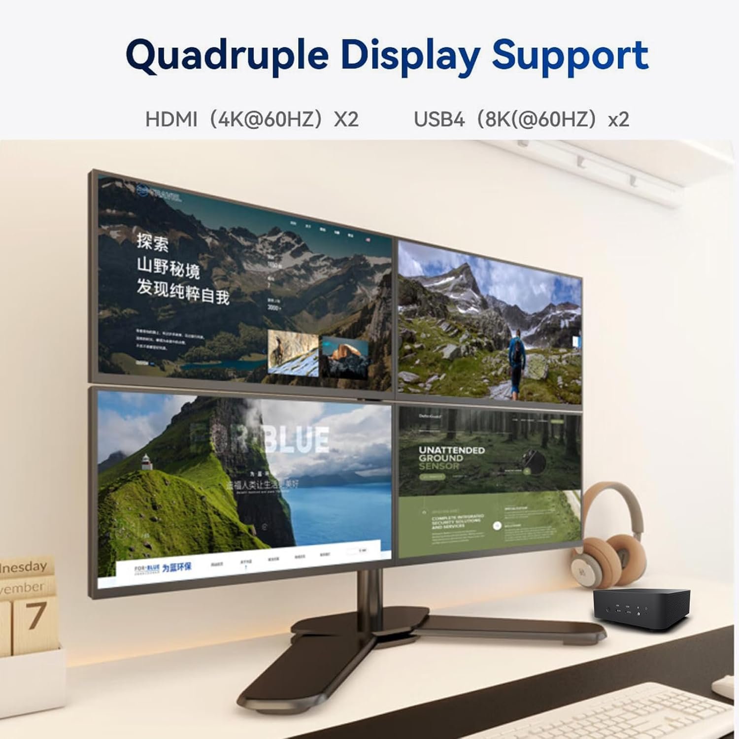 【Support 4K quad-Screen Display】UM790 Pro Personal Computer with 2x HDMI(4K@60Hz) and 2x USB4(8K@60Hz), which support four monitors display simultaneously and provide a larger and wider filed of view to improve your work efficiency. Through the USB4 interface, a single cable can drive a 15w mobile display.