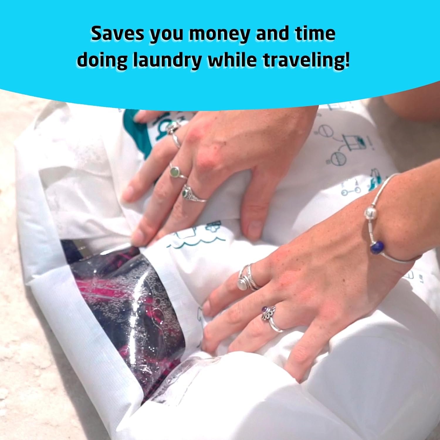 How to wash clothes while traveling or camping? Simply add water, cleaning product and clothes; seal the closure; deflate the bag; rub clothes against the inner washboard (30sec to 3min); rinse the clothes; and hang the clothes to dry.