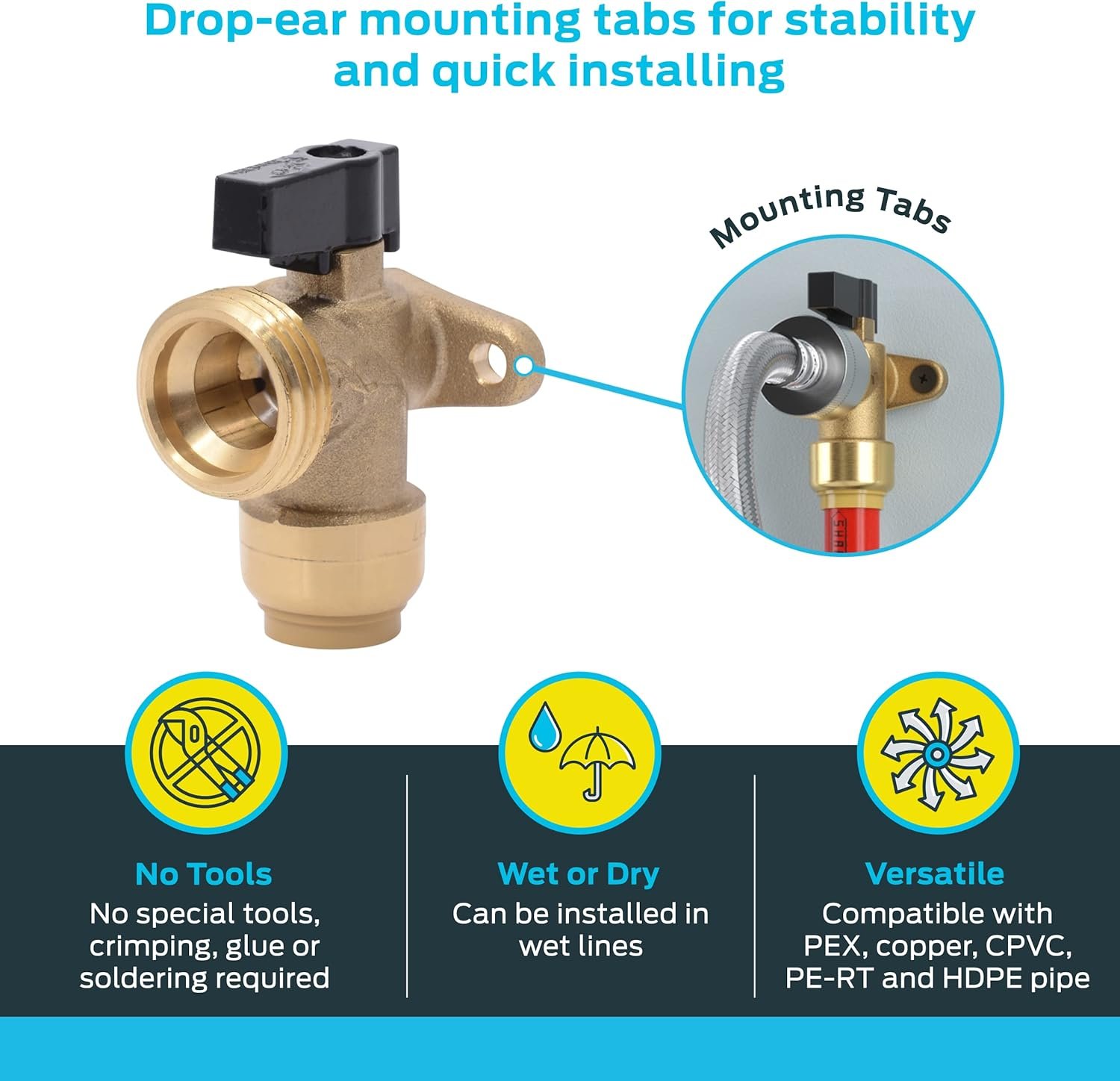VERSATILE: This plumbing valve can be mounted to a stud or joist, and features a 1/2-inch push-to-connect inlet that works well with PEX, CPVC, PE-RT, SDR-9 HDPE, and copper pipes; features a quarter-turn angle water valve with mounting brackets
