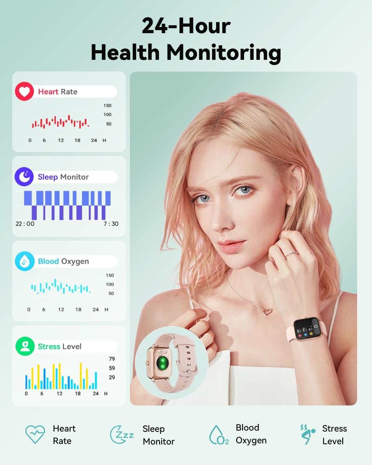 【24/7 Health Monitor and Sleep Tracker】Smart watch for android phones /iphone equiped with 7 high-performance optical sensors, continuously recording your daily walking steps, distances, calories, and monitoring your heart rate, SpO2, stress level, and sleep status (deep sleep, light sleep, and wakefulness). More features, such as sedentary reminders and water drinking reminders, allow you to keep track of your health data and constantly remind you to maintain a healthy lifestyle. Non-medical use.
