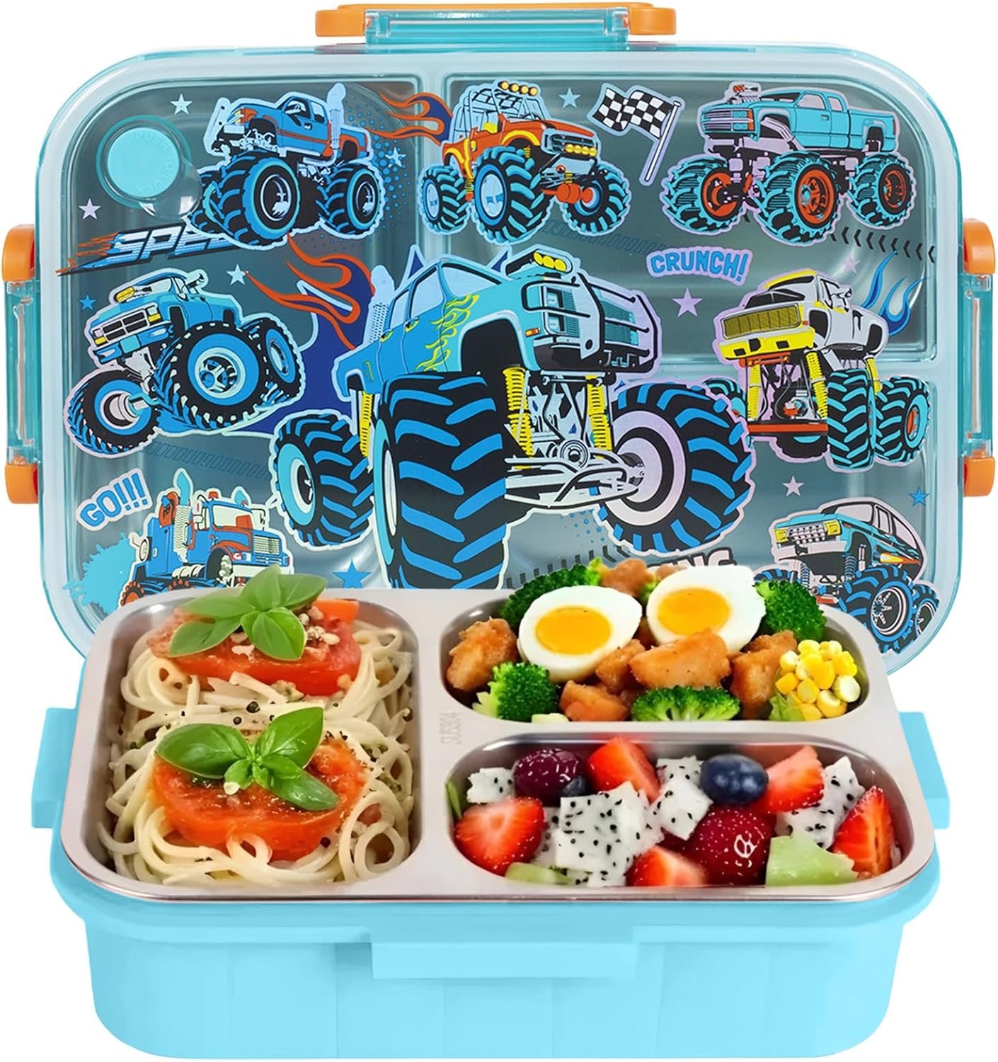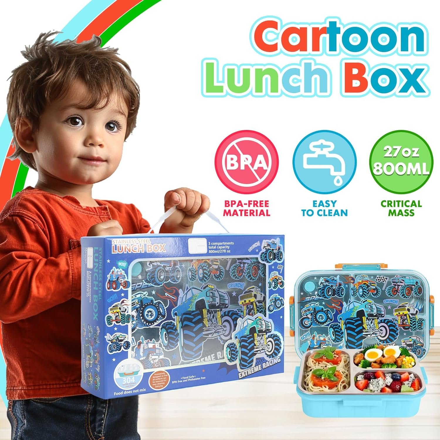 KIDS FAVORITE CARTOON RACING PRINT: Cute cartoon racing design, adding more interest for kids, which make your child love to take it out and let your children enjoy lunch happily; Great gift for kids who back to school or school office supplies; 800ml/27oz large capacity is practical for daily use; Size for ages 3-7