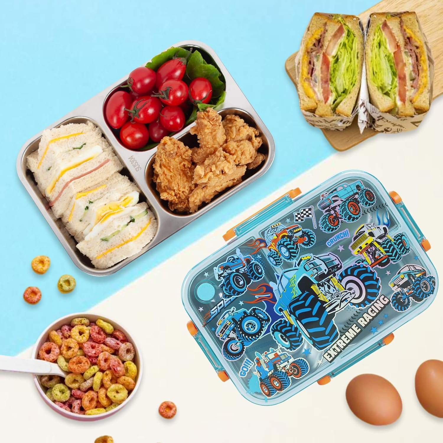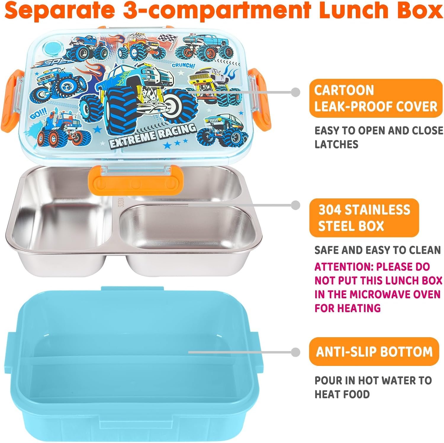 LEAK-PROOF TECHNOLOGY: Designed with 4 kid-friendly latches that are easy for kids to open and close; And leak-proof cover using anastomosis rubber seals, which can firmly lock in food and prevent leakage; Keeps meals and snacks fresh and mess-free during transport; Kindly Note: After the lunch box is filled with food, the tray will not stick tightly to the lid