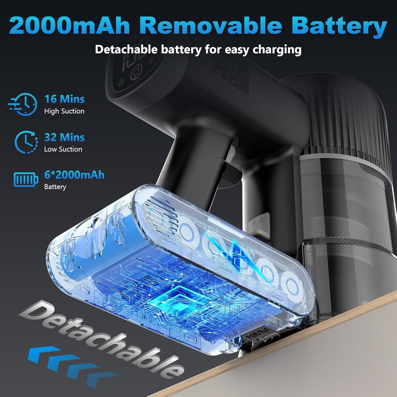 Wall-Mounted Charging Dock: Featuring a 6*2000 mAh rechargeable battery and a wall-mounted charging station, this cordless vacuum cleaner offers versatile charging options. You can detach the battery for separate charging or place the vacuum on the dock for automatic charging and convenient storage