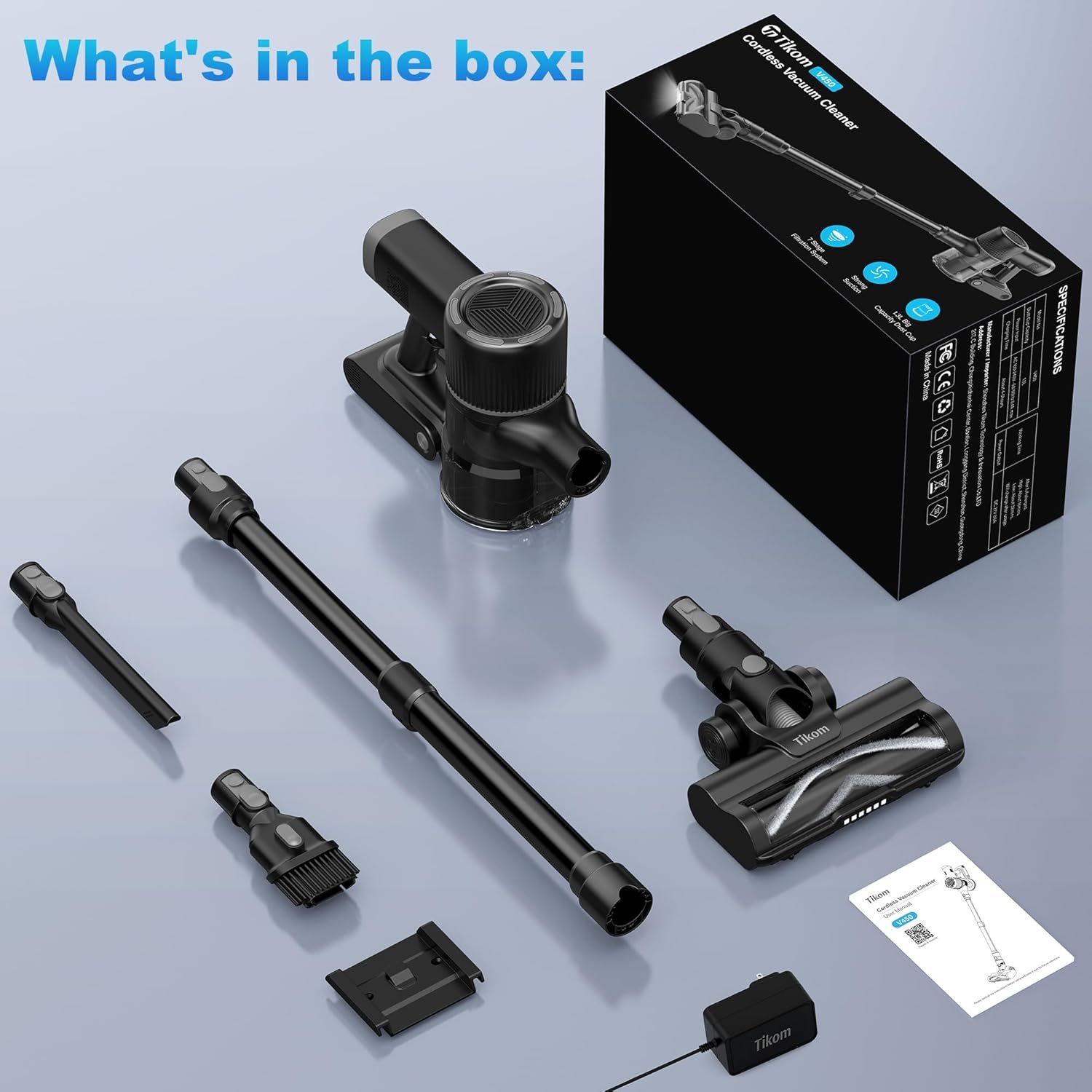 What will you get: Vacuum Cleaner*1, Wall Dock*1, Wall Screws with Plastic Expansion Anchor*4, Plastic Expansion Anchor*1, Battery*1, Motorized Cleaner Head*1, Crevice Tool*1, 2-in-1 Soft Dusting Brush*1, Length Adjustable Extension Wand*1, Adapter*1, User Manual*1