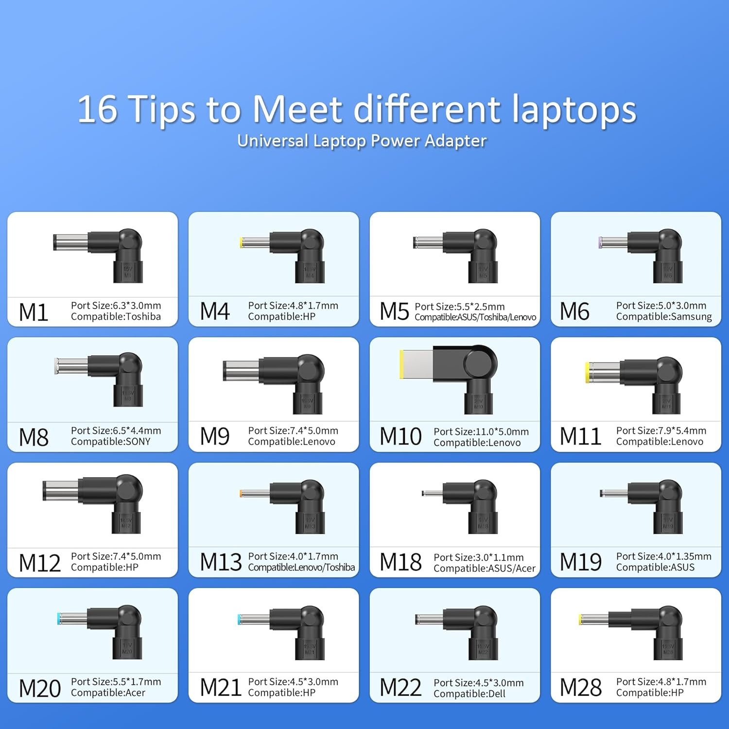 M1: 15V, 6.3×3.0mm fit for replacement for Toshiba Tecra A6 A7 A8 A9 A10 F Satellite 1400 Series Satellite 1800 Series M4: 18.5V, 4.8×1.7mm fit for replacement for HP Pavilion DM3 DM3t DM3z DV2000 Dv2000t DV2100 DV2200 Compaq Presario 300 305 900 1500 1510 2200 2800 B2800 Series M5: 19V, 5.5×2.5mm fit for Asus A52F A53E A53S A54C A55A A55VD A56C A56CA A56CM ; Lenovo IdeaPad N580 N581 N585 N586 ; Toshiba Satellite C50 C55 C75 C55D C55DT C55T C75D CL15T CL45 E45 E45T L15 L55 L55D L55T L75 P50 P55T P50t P55 S55 S75 series laptop charger ac adapter power cord supply; JBL Xtreme 2 Extreme 2 Boombox Wireless Bluetooth Portable Speaker Boost TV SoundBar; Acer S2 H2 G2 LCD LED Monitor 19V 19″ 20″ 22″ 23″ 24″ 25″ 27″ 29″ 32″ 34″ LG LED LCD 3D 720P 1080P TV 4K Gaming Ultrawide Smart LED Monitor M6: 19V, 5.0×3.0mm fit for replacement for Samsung GS6 GT6 GT7 GT8 X05 VM GT NT N110 N120 N130 N140 N145 N150 N210 N220 N310 N510 NB30 NC10 NC110 NC20 NC215S NF210 NF310 P530 Q330 Q430 Q530 QX410 QX411 ATIV Book 2 Series M8: 19.5V, 6.5×4.4mm fit for replacement for SONY VAIO VGP-AC19V39 VGP-AC19V47 Fujitsu PenCentra 130 200 Series M9: 19.5V,7.4*5.0mm fit for replacement for Dell Latitude 7480 5480 7280 5580 7214 5404 5414 7414 2100 2110 2120 3150 3160 3190 3300 3330 3340 3350 3380 3450 3470 3480 3540 3550 3580 5250 5270 5420 5470 5500 6430u E5250 E5270 E5430 E5440 E5450 E5470 E5480 E5540 E5550 E5570 E5580 E6230 E6410 E6430 E6430 ATG E6430s E6440 E6510 E6520 E6530 E7240 E7250 E7270 E7280 E7440 E7450 E7470 E7280 7400 7404 Chromebook 11 3120 3180 3189 730-8301 CB1C13 730-8302 Touchscreen 11″ 11.6″ series laptop charger ac adapter power cord supply M10: 20V, 11.0×5.0mm fit for (Yellow square tip)replacement for Lenovo ThinkPad X1 Carbon 1st 2nd 3rd 4th Generation Thinkpad X1 Yoga 1st Generation Yoga 2 11 11E 12 13 730-15 T T431s T440 T440p T440s T450 T450s T460 T460s T470 T470s T550 T560 T570 TP25 X X240 X240S X250 X260 X270 Z Z50 Z50-70 Z50-75 Z70 Z70-80 Series M11: 20V, 7.9×5.4mm fit for replacement for Lenovo IBM ThinkPad T400 T410 T410s T420 T420s T430 T430s For Lenovo ThinkPad N100 L410 L412 L420 L421 L510 L512 L520 Series M12: 19.5V, 7.4×5.0mm fit for replacement for HP Pavilion DM1 DM1z DM4 DM4t DM4x EliteBook 725 740 745 755 820 840 850 G1 G2 Series M13: 19V, 4.0×1.7mm fit for replacement for Lenovo ideaPad 110 100 100S 120 120S 500 500s 300 300s 310 320 320s 330s S145 Yoga 710 510 Flex 4 5 80T7 ADL45WCC PA-1450-55LL GX20K11838 Series,ThinkPad X1 Carbon 1st 2nd 3rd 4th Generation Thinkpad X1 Yoga 1st Generation Yoga 2 11 11E 12 13 730-15 T T431s T440 T440p T440s T450 T450s T460 T460s T470 T470s T550 T560 T570 TP25 X X240 X240S X250 X260 X270 Z Z50 Z50-70 Z50-75 Z70 Z70-80 Series M18: 19V, 3.0×1.1mm fit for replacement for Acer Chromebook 11 13 14 15 N7 R11 C731 C731T C731-C8VE CB311-7H N16Q13 Acer Aspire V 13 V13 Touch V3-331 V3-371 V3-372 V3-372T Aspire S5 S7 S5-371 S5-391 S7-191 S7-391 S7-392 S7-393 Acer Aspire R 14 13 R15 R5-471T R7-371T R7-372T Acer Aspire One Cloudbook 11 14; Asus Zenbook UX21E UX31E T300 CHI T300CHI Asus Transformer Book T200 T200T T200TA T200TA-C1-BL T200TA-DB11T-CA M19: 19V, 4.0×1.35mm fit for replacement for Asus Vivobook 11.6″ S200E X202E Q200E X201E 14″ F441BA X420U X420UA X441BA X451 X451C X451CA X451M X451MA X451MAV 15″ F F510 F510U F510UA F510QA F512D F512DA F556U X X505 X505BA X505BP X505Z X505ZA X510U X510UQ X540SA X541N X541NA X542UA X551C X551CA X551MA X551MAV X553M X553MA X555 X555B X555BA X555L X555LA X555U X555UA X555Y X555YA 17″ X751M X751MA X756 X756U X756UA Flip 12 TP202NA J401M Flip 15 Q505U Q505UA Q504UA 13 324U Q324UA and more M20:19V, 5.5×1.7mm fit for replacement for Acer Aspire 1 3 5 E15 E14 E11 ES1 E5 E3 E1 F15 V15 VN7 V5 V3 V7 V5-131 V5-171 V5-431 V5-471P V5-472 E15 N15W4 E14 E11 ES1 E5 E3 E1 E17 F15 E5-553 E5-575 E5-575-33BM Timeline Ultra TravelMate Series; Gateway MD7818U MD7820U NE56 NE56R10U NE56R11U NE56R12U NE56R13U NE56R15U NE56R27U NE56R31U NE56R34U NE56R37U NE56R41U NE56R42U NE71B06U NV55C NV57H NV59 NV59C NV73 NV79 Q5WTC M21: 19.5V, 4.5×3.0mm fit for replacement for HP Pavilion Elitebook TouchSmart 725 745 755 820 830 840 850 G3 G4 G5 ProBook 430 440 450 455 470 640 650 G1 G2 G3 G4 G5 G6 G7 x360 Pavilion x360 Stream 11 Pro G3 G4 EE Chromebook 11 EE G2 G3 G4 G5 Spectre x360 x2 Folio Elitebook Folio 1020 1030 1040 G1 G2 G3 Zbook 14 14u 15u x2 G2 G 3 G4 Series M22: 19.5V, 4.5×3.0mm fit for replacement for Dell Inspiron 11 13 14 15 17 3000 5000 7000 3420 3437 3442 344315 3520 3521 3531 3537 3542 5520 7537 3135 3137 3138 3147 3148 5323 3437 3421 5421 5437 1470 5423 3520 3537 3541 3542 3543 5547 5548 5552 7537 7547 5520 5521 5537 7520 3721 3737 5748 5749 7548 7737 7746 5720 5721 5737 3531 XPS 13 15 17 series 9310 9300 9360 9343 9350 9360 L412z Vostro 2420 2520 3300 3350 3360 3470 3480 5502 5370 5581 Series PA-10 PA10 PA-12 PA12 M28: 19.5V, 4.8×1.7mm fit for replacement for HP Pavilion DM3 DM3t DM3z DV2000 Dv2000t DV2100 DV2200 Compaq Presario 300 305 900 1500 1510 2200 2800 B2800 Series