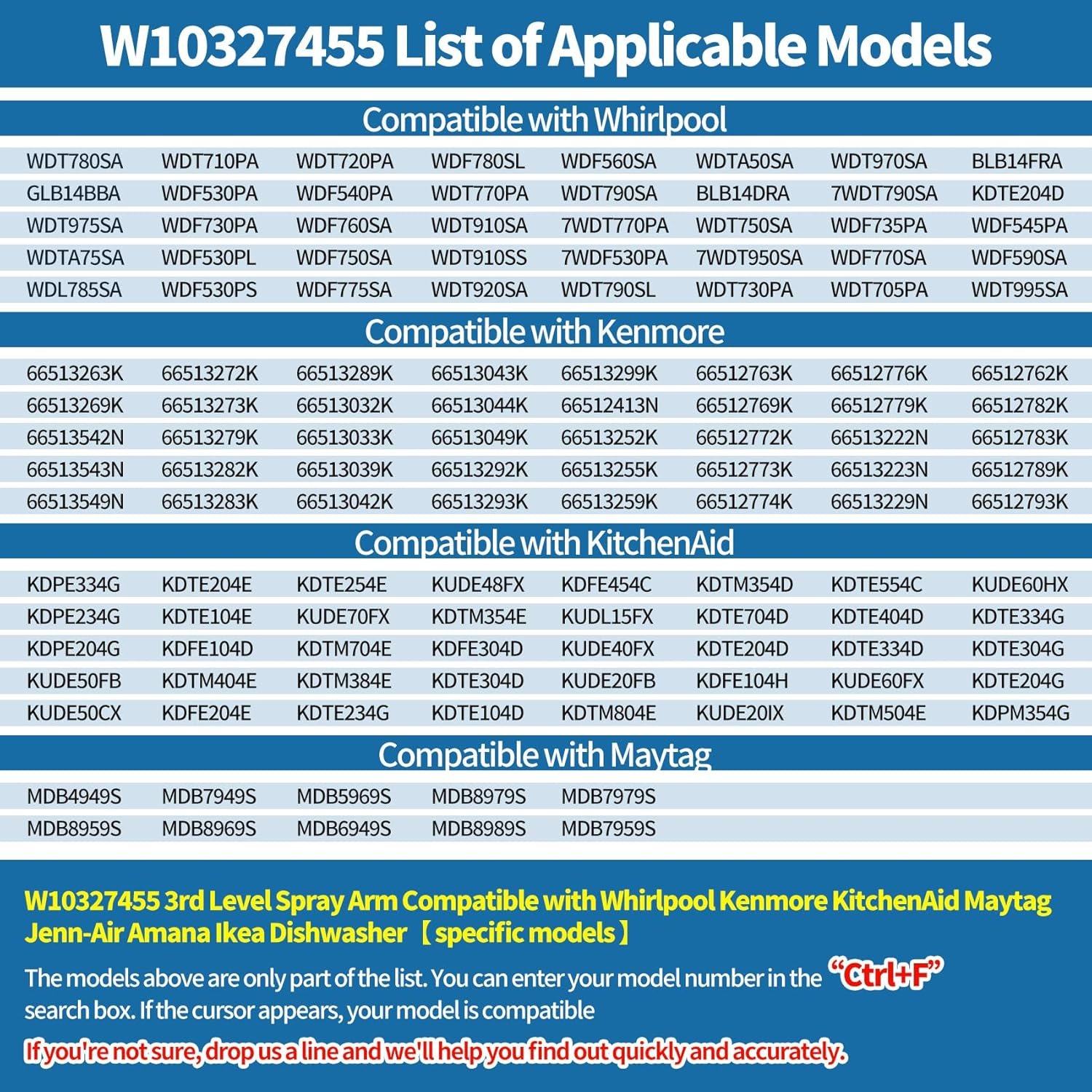 WPW10327455 3rd-Level Spray Arm Replacement for Whirlpool Dishwasher – Compatible Models: his WPW10327455 dishwasher wash arm replacement for Whirlpool dishwasher. It is compatible with Kenmore Whirlpool KitchenAid Maytag Jenn-Air Amana Ikea dishwasher models. The WPW10327455 WPW10327455 upper spray arm fits models including WDT710PAYB2, WDT710PAYE2, WDT710PAYE3, WDT710PAYE4, WDT710PAYH2, WDT710PAYH3, WDT710PAYH4, WDT710PAYW0, WDT710PAYW1, WDT710PAYW2, WDT710PAYW3, WDT710PAHZ0, WDT710PAHB0, WDT710PAHB1, WDT710PAHW0, WDT710PAHW1, WDT710PAHZ1, WDT710PAYB0, WDT710PAYB1, WDT710PAYB3, WDT710PAYB4, WDT710PAYB5, WDT710PAYB6, WDT710PAYE5, WDT710PAYE6, WDT710PAYH5, spray arm etc