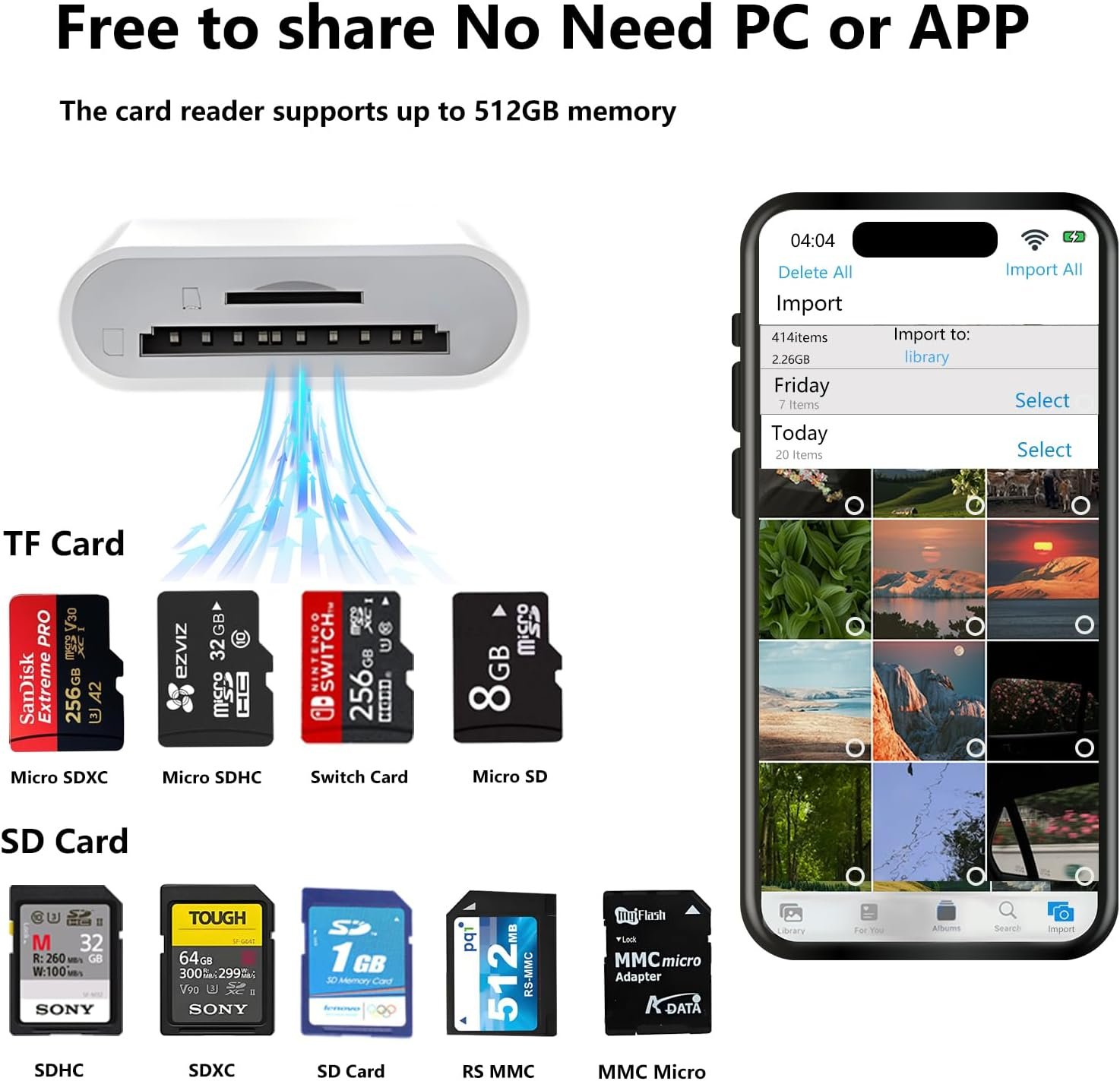【2-IN-1 DUAL SLOTS DESIGN】 – The USB C SD card reader for iPhone adopts dual card slots design, the SD card reader USB C includes both an SD and a micro SD card slot, compatible with SD/SDHC/SDXC/Micro SD/Micro SDXC/Micro SDHC memory cards. You can easily view the photos and videos in the memory card anytime and anywhere, and upload them to social platforms. The USB C SD card reader for iPhone is a good partner for your traveling and playing.