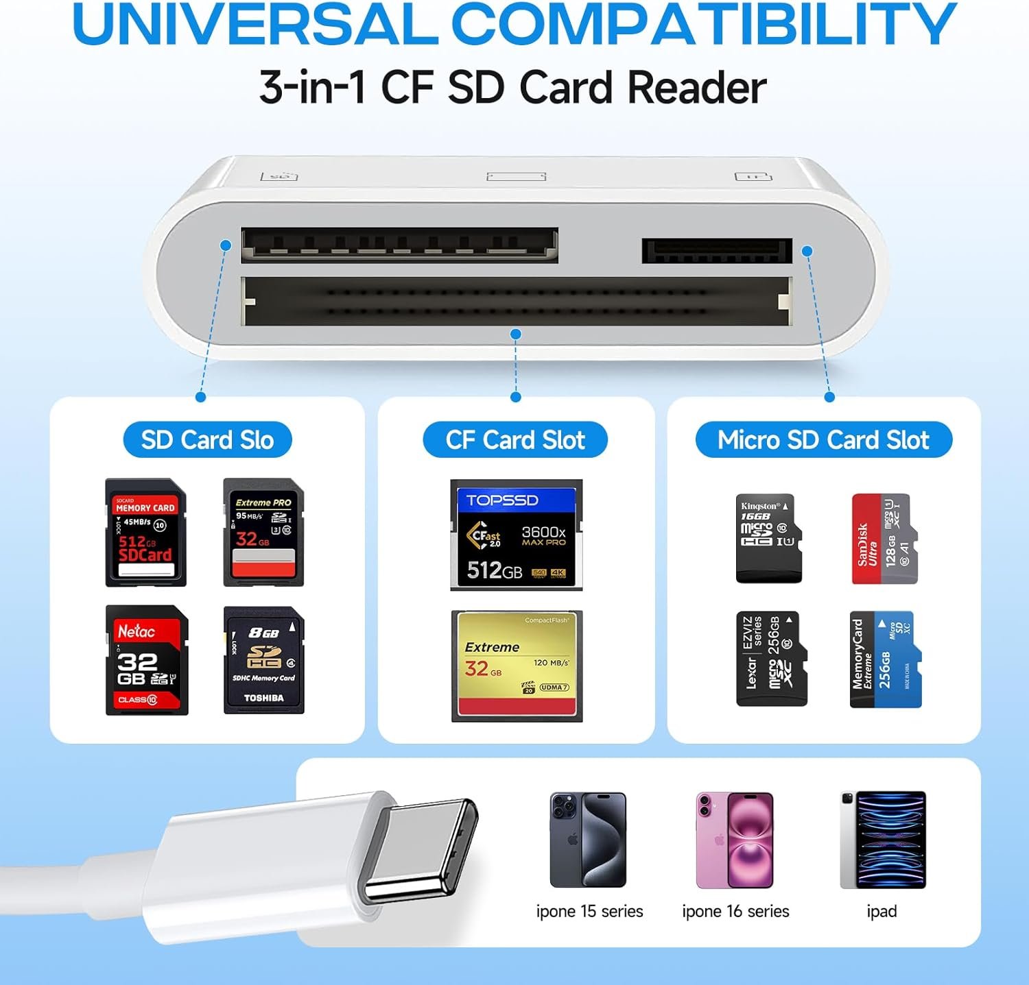 【3-IN-1 CARD SLOT】- The USB C SD card reader for iPhone supports SD, Micro SD and CF cards, and compatible with iPhone 16/15, iPad, Mac, Android phones and laptops. The USBC memory card reader lets you easily view photos and videos from a variety of camera memory cards and upload your files anytime, anywhere. The USB C SD card reader for iPhone is an excellent choice for downloading content from your digital camera directly to your iPhone/iPad.
