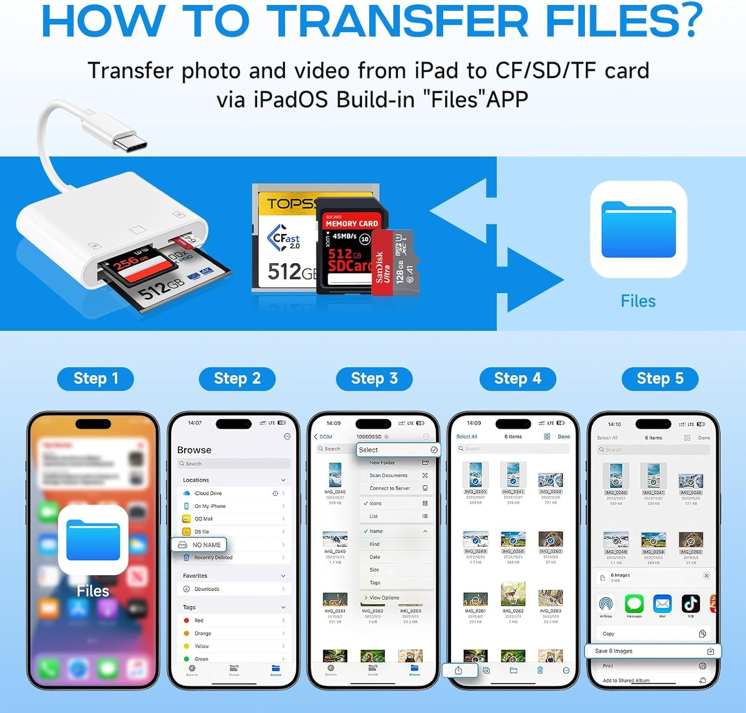 【EASY TO SHARE】- The USB C SD card reader for iPhone make it easy to download photos and videos from your digital camera directly to your iPhone or iPad. Enjoy seamless two-way transfer functionality tailored for iOS 13 to latest iOS. Effortlessly import data from SD, TF or CF cards to your iPhone, or export files from your iPhone to SD, TF or CF cards. Supports Word, PowerPoint, Excel, PDF and more.