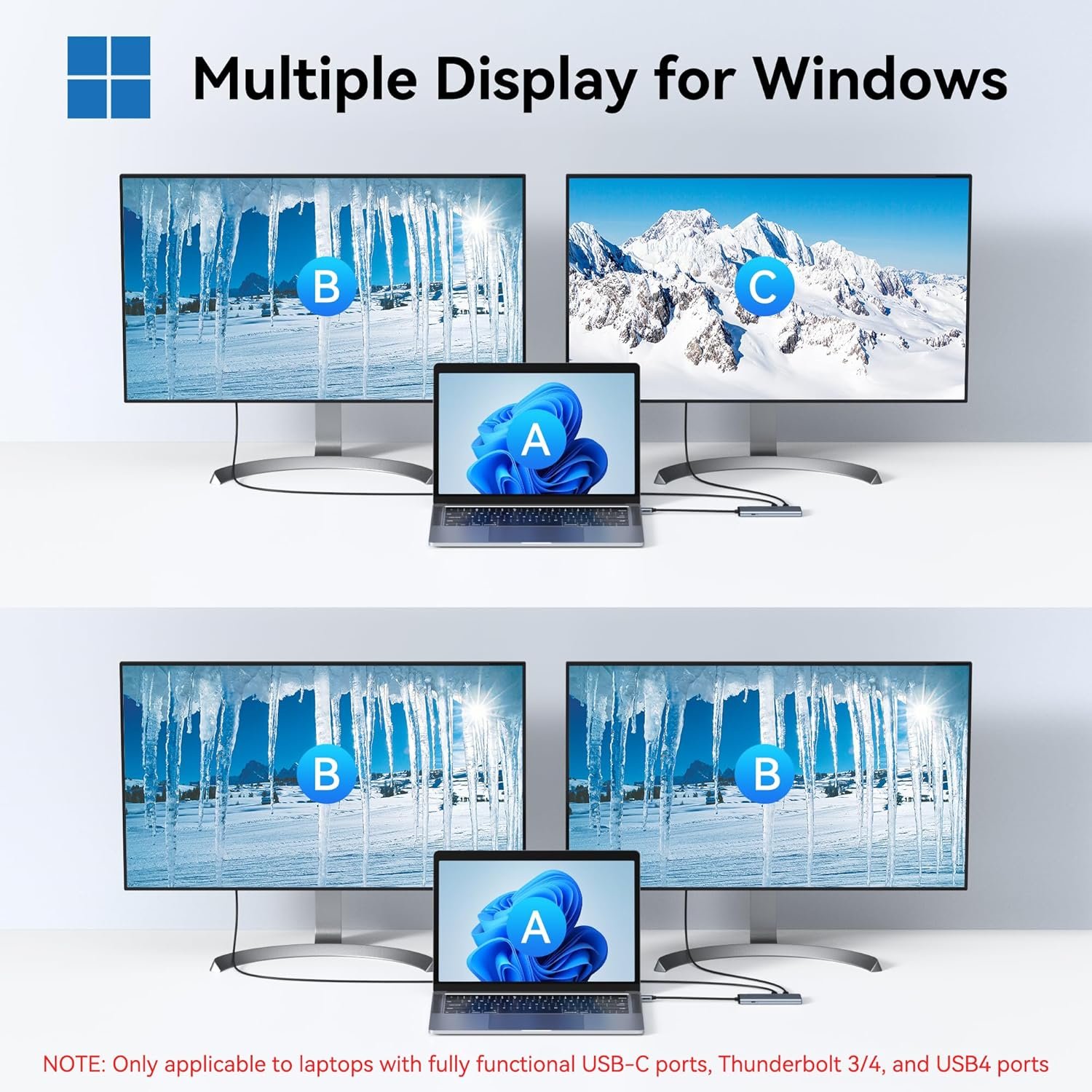 MST/SST USB C Splitter for Windows: This USB C video hub supports MST/SST dual-display modes exclusively for Thunderbolt 4/USB 4 Windows laptops, enabling 4K/60Hz on two USB C monitors. MST functionality is not supported on macOS systems