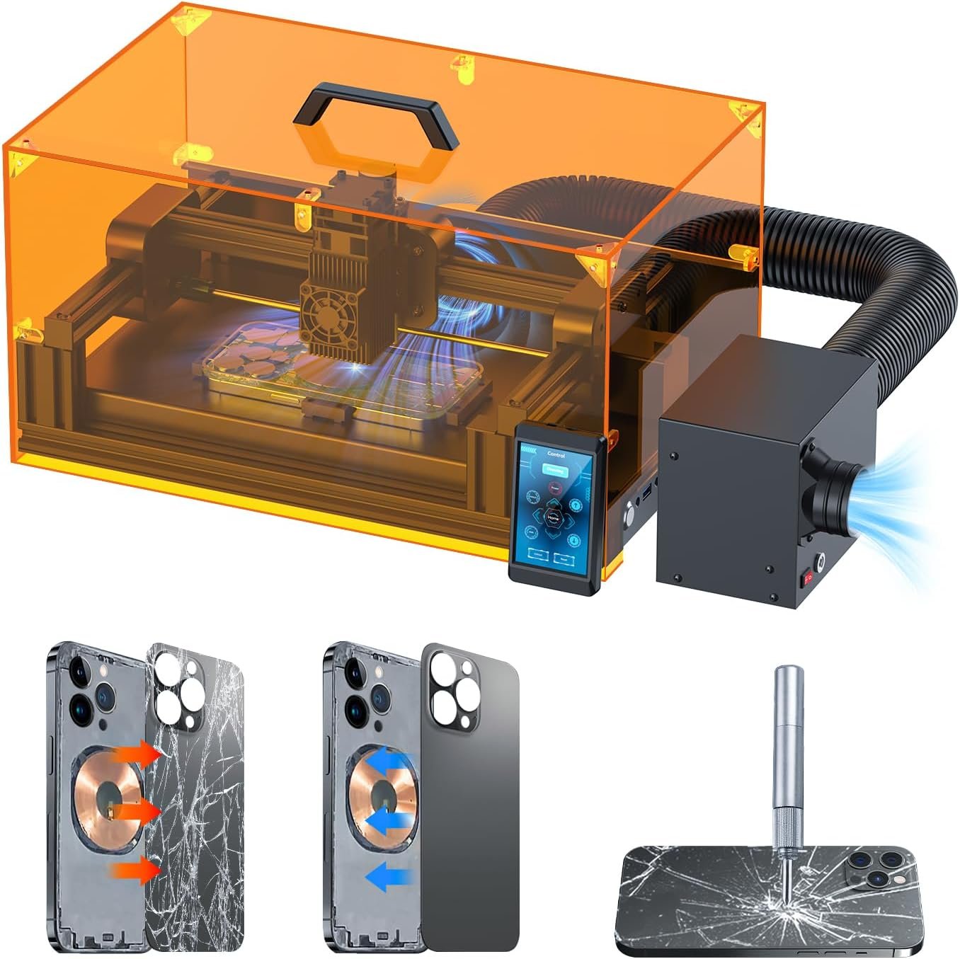 【Stable & High-Speed Performance】: Built with durable aluminum alloy and featuring a 360° orange viewing cover, our machine removes even stubborn white back glass safely in just 7-16 minutes. Monitor progress easily throughout.