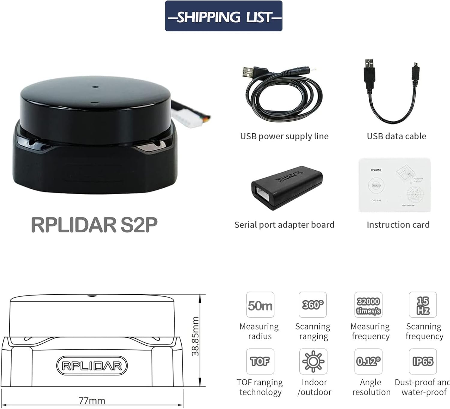 [High-Speed Laser Ranging Capability] RPLIDAR S2P lidar sensor adopts laser SL-TOF ranging technology, 32KHz times/second frequency, 0.05~50m measuring distance, 10~20Hz Scan frequency, 0.15°~0.18° resolution and TTL UART interface. Size: 77 x 77 x 38.85mm. And it uses non-contact energy and signal transmission technology, so that the S3 lidar can run stably and reliably for a long time.