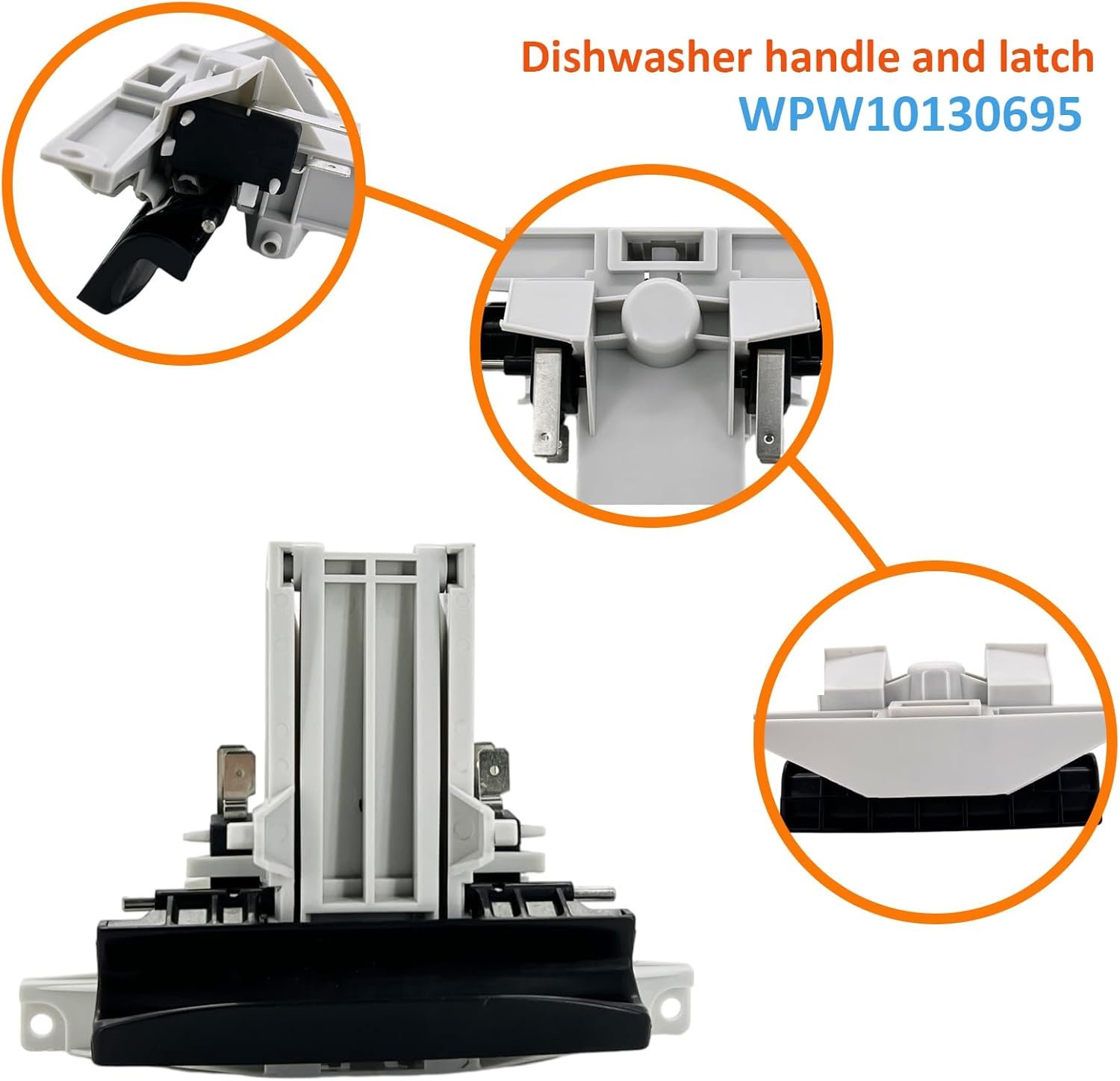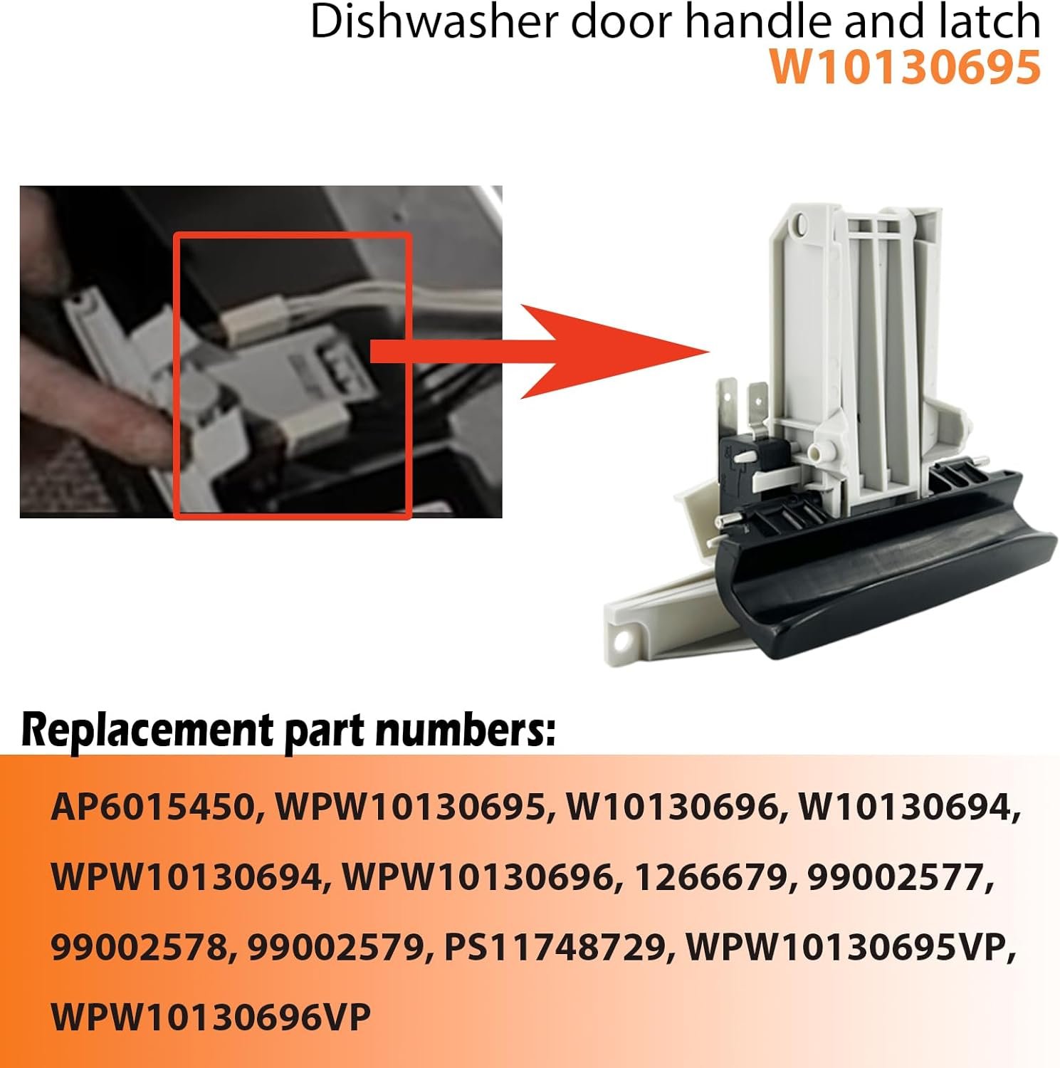 REPLACEABLE PART NUMBER: The wpw10130695 dishwasher door latch assembly replaces: W10130695, PS11748729, AP6015450, W10130696, W10130694, WPW10130694, WPW10130696, 1266679, 99002577, 99002578, 99002579, WPW10130695VP, WPW10130696VP