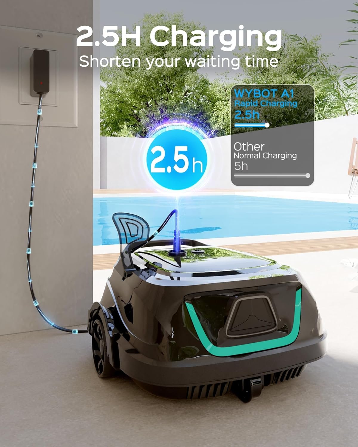 Rapid 2.5-Hour Charging: Bid farewell to the prolonged 6-7 hour charging times – now, a mere 2.5 hours is all it takes to unleash the power of a fully charged cordless pool robot. Embrace quick and efficient charging with the latest technology, transforming your pool cleaning experience.