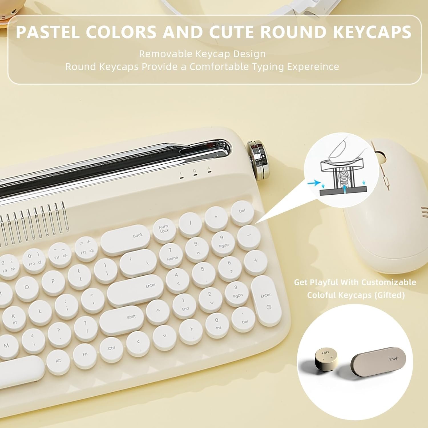 2 extra pastel keycaps included in the packageRetro keyboard typewriter stylePastel colored keyboard with round keycaps.
