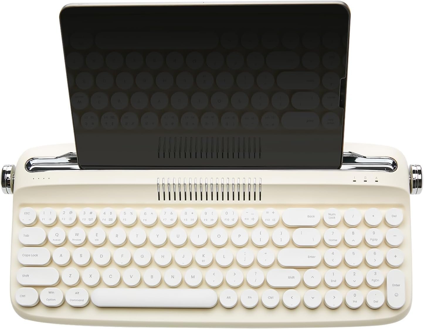 VINTAGE TYPEWRITER KEYBOARD WITH INTEGRATED STAND: The wireless typewriter keyboard includes an integrated stand holder for pad, phone and tablet, which matches the vintage aesthetic of your desk and home office. The retro keyboard also includes adjustable feet, allowing you to set the angle for maximum comfort during long typing sessions. The built-in tablet or phone holder is 13.7 x0.5 inches that can fit most pads.